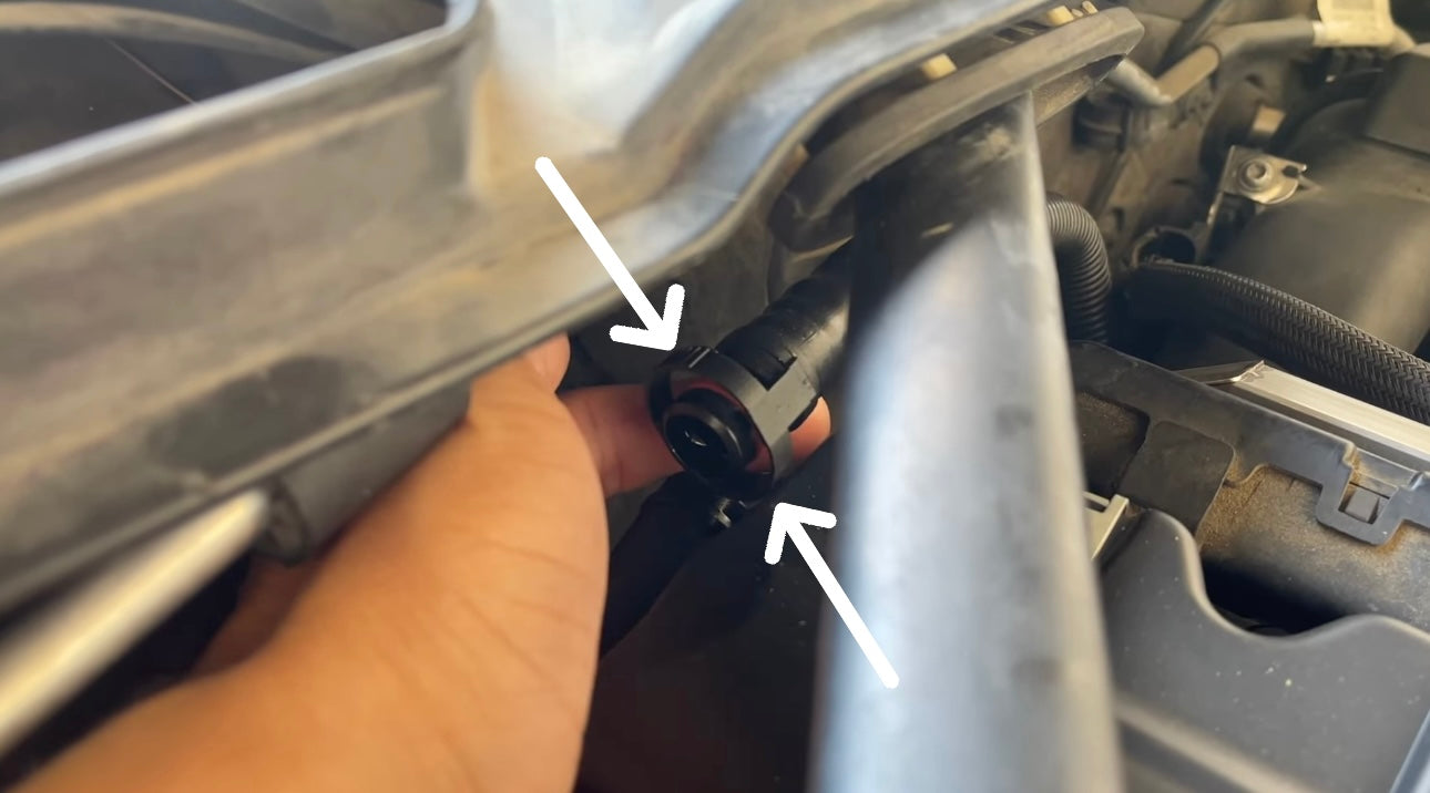Detach the crankcase breather hose from the valve cover by depressing the retention clip and pulling it from the nipple.