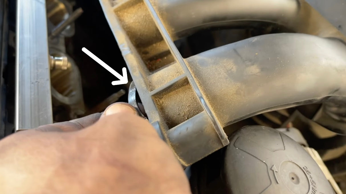 Loosen the band clamp that holds the air intake hose to the throttle body, with a flathead screwdriver.