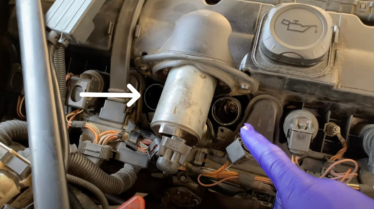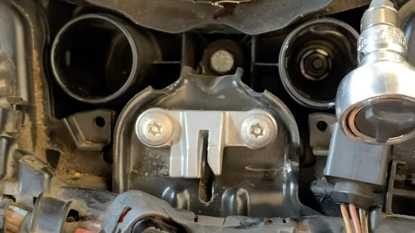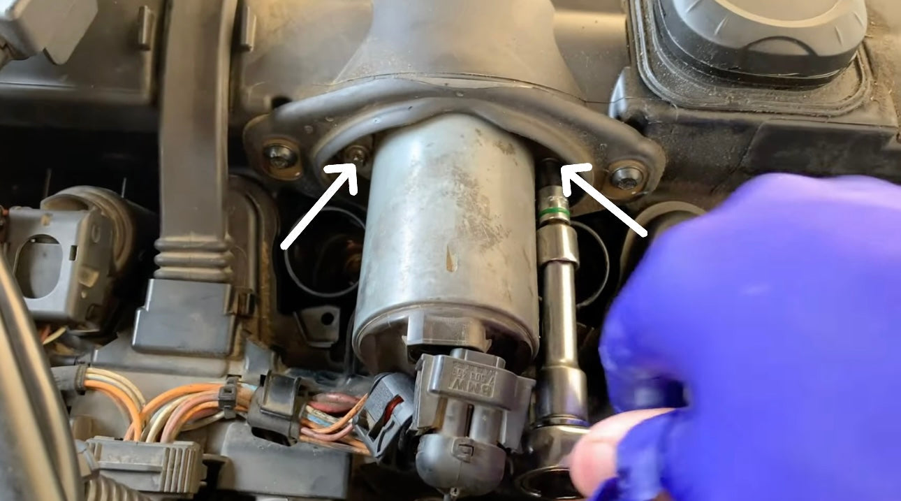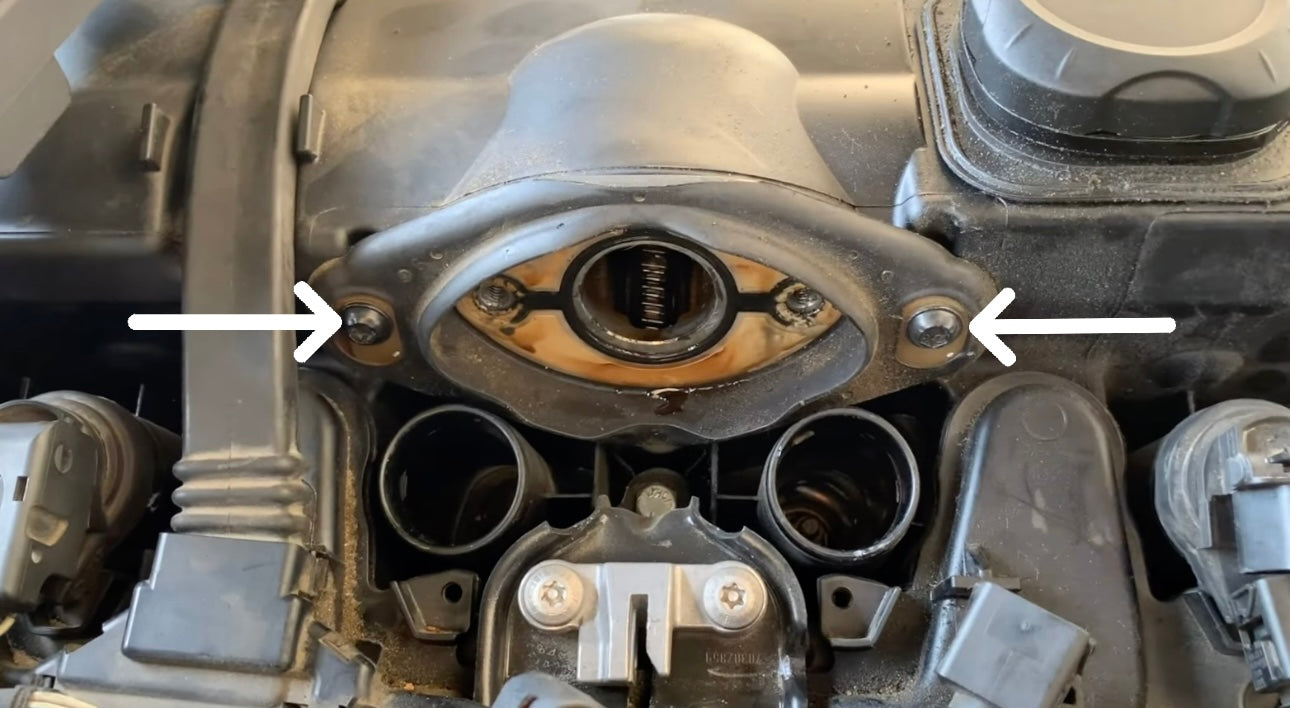 Reinstall the two T-30 screws that hold the valvetronic motor gasket in place (white arrows).