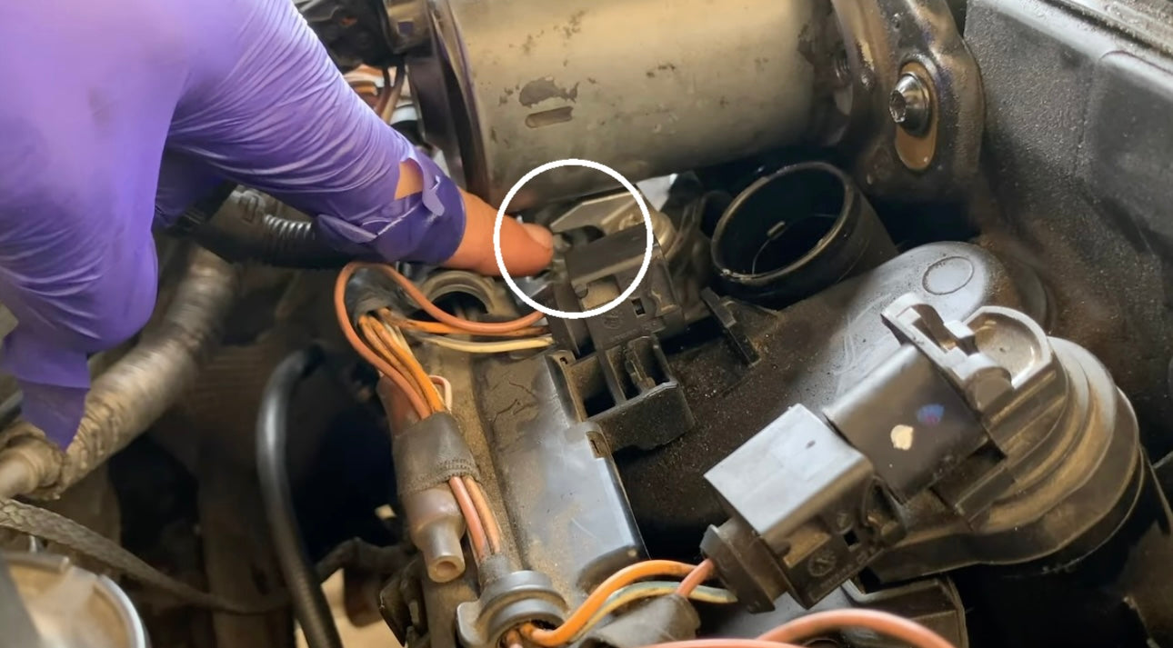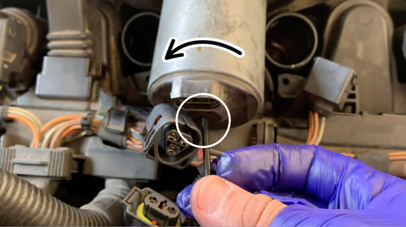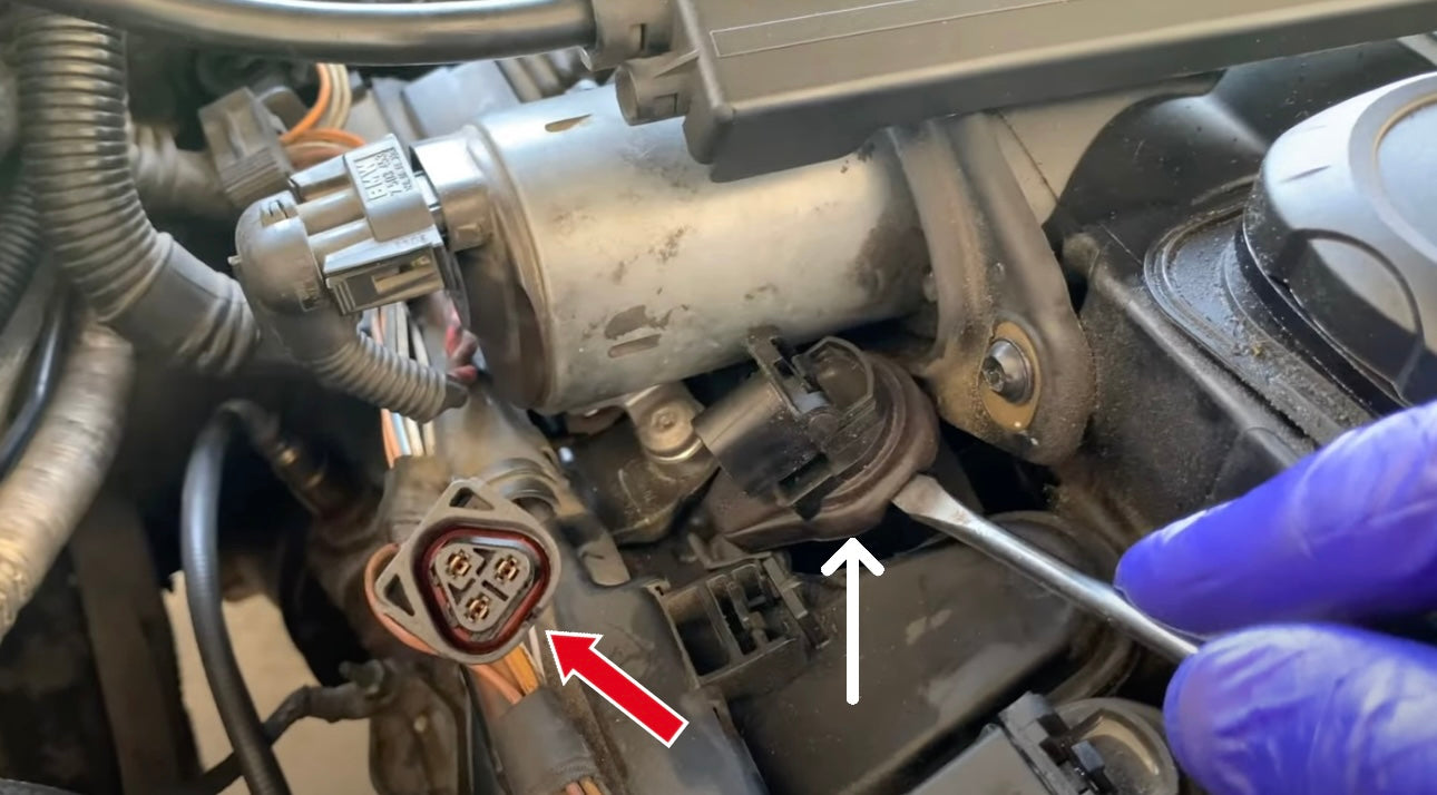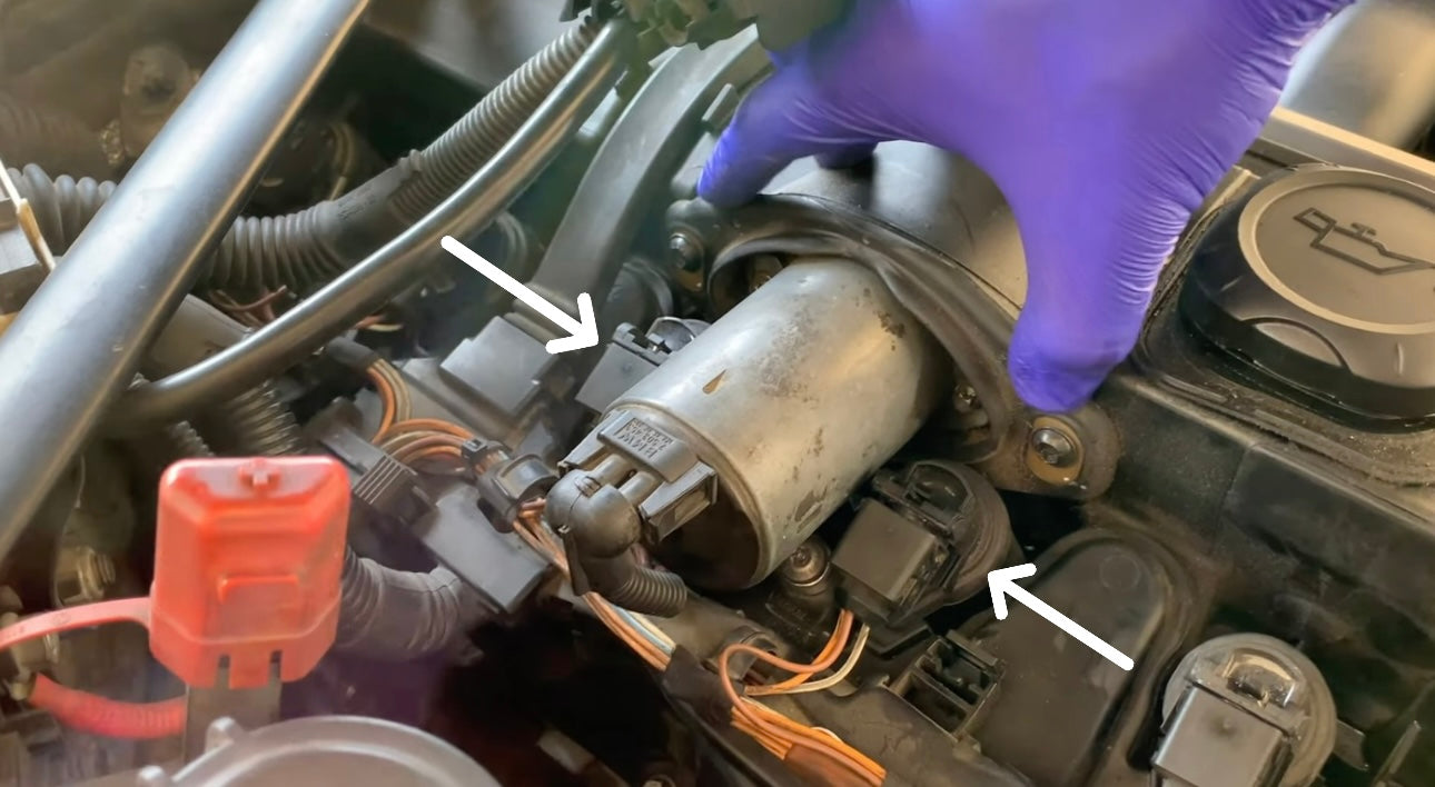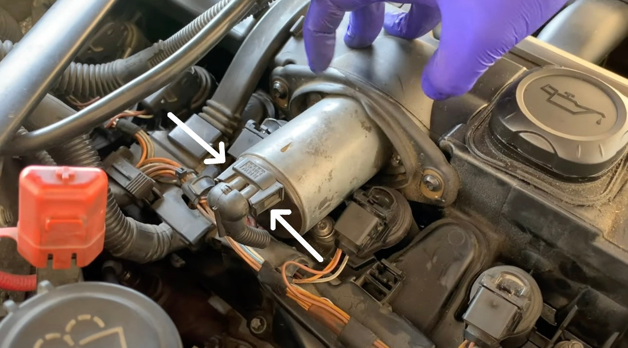 Unplug the valvetronic motor connector by pressing the retention tabs down (white arrows) and pulling it off.