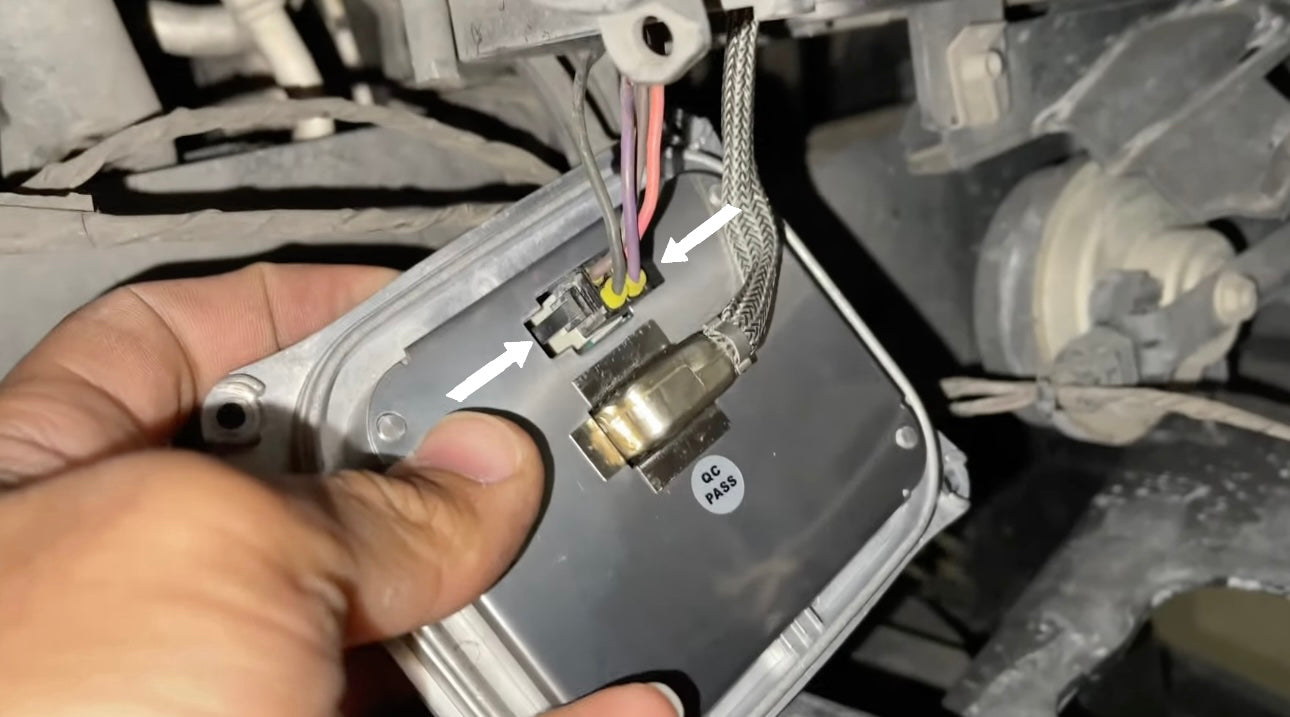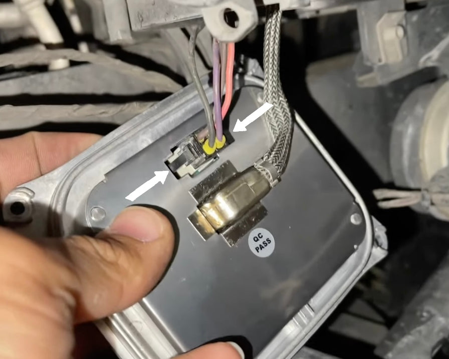 Connect the new headlight ballast to the headlight assembly. Ensure the bottom connector is routed so the cables go towards the front of the vehicle (white arrow).