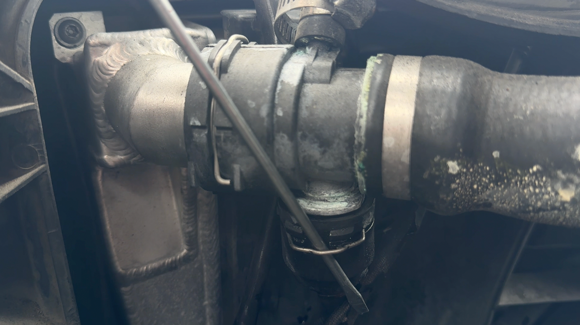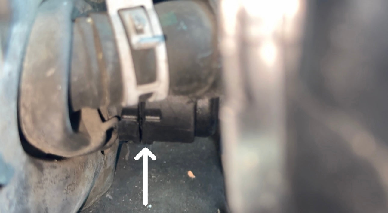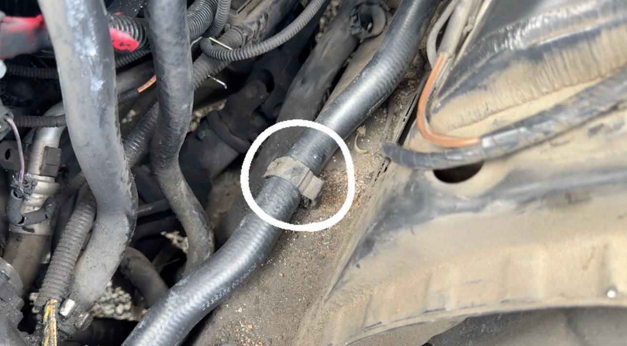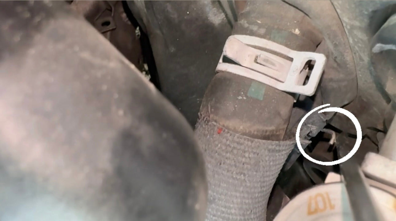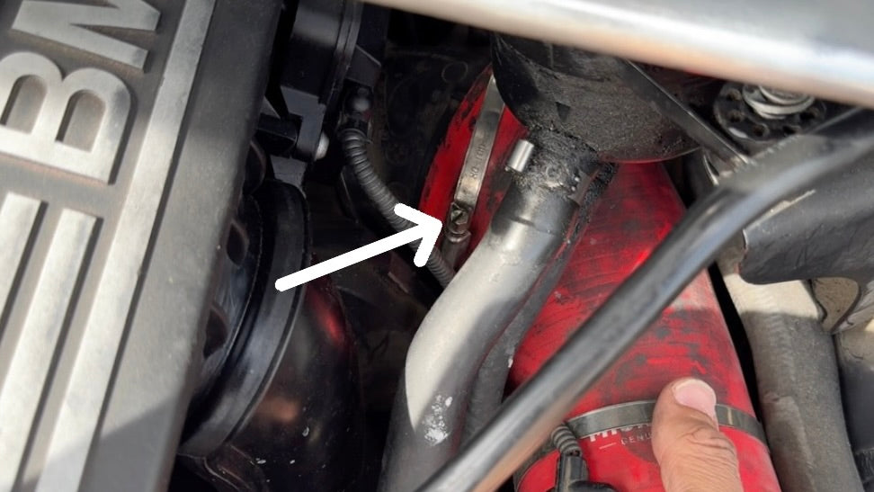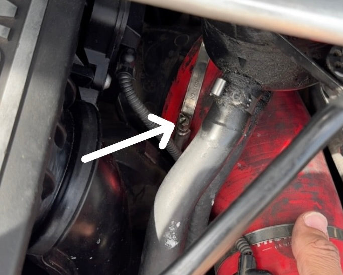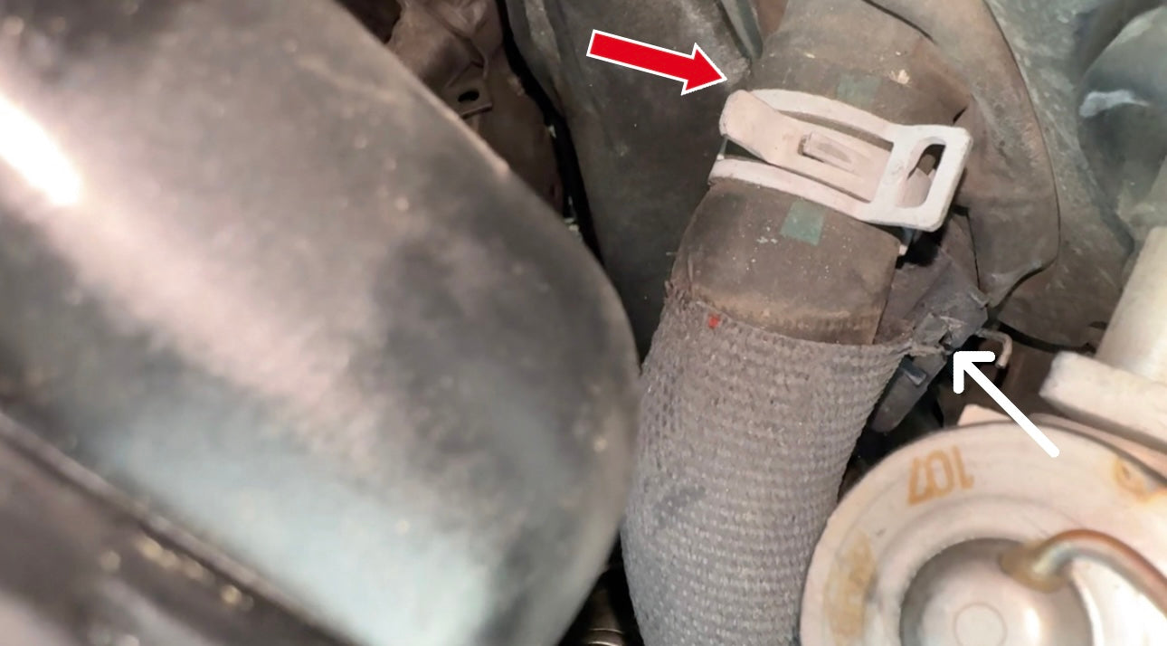 The hose being replaced is not the top hose with the silver clamp (red arrow). The hose we are replacing is directly underneath (white arrow).