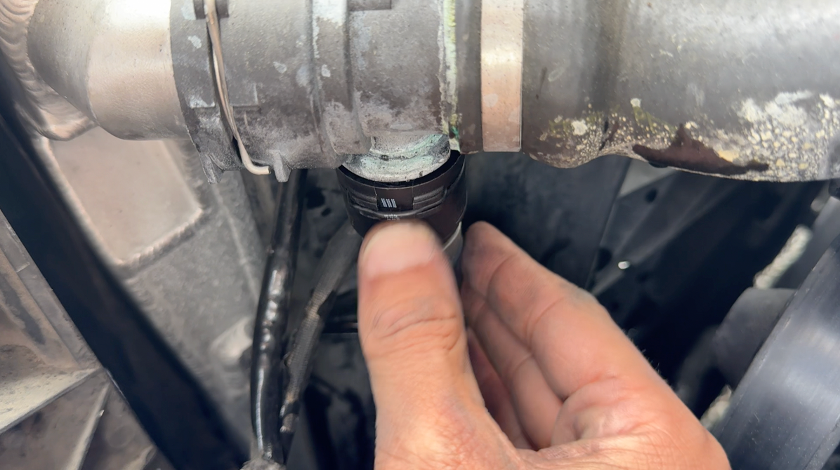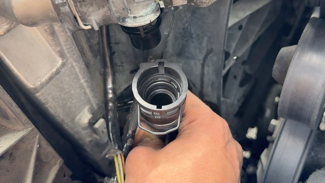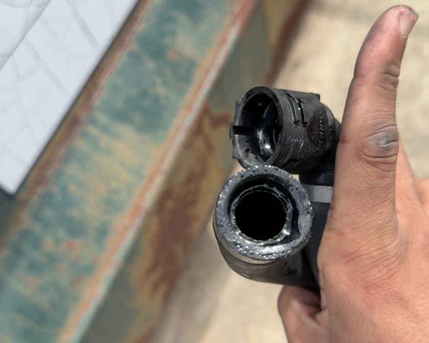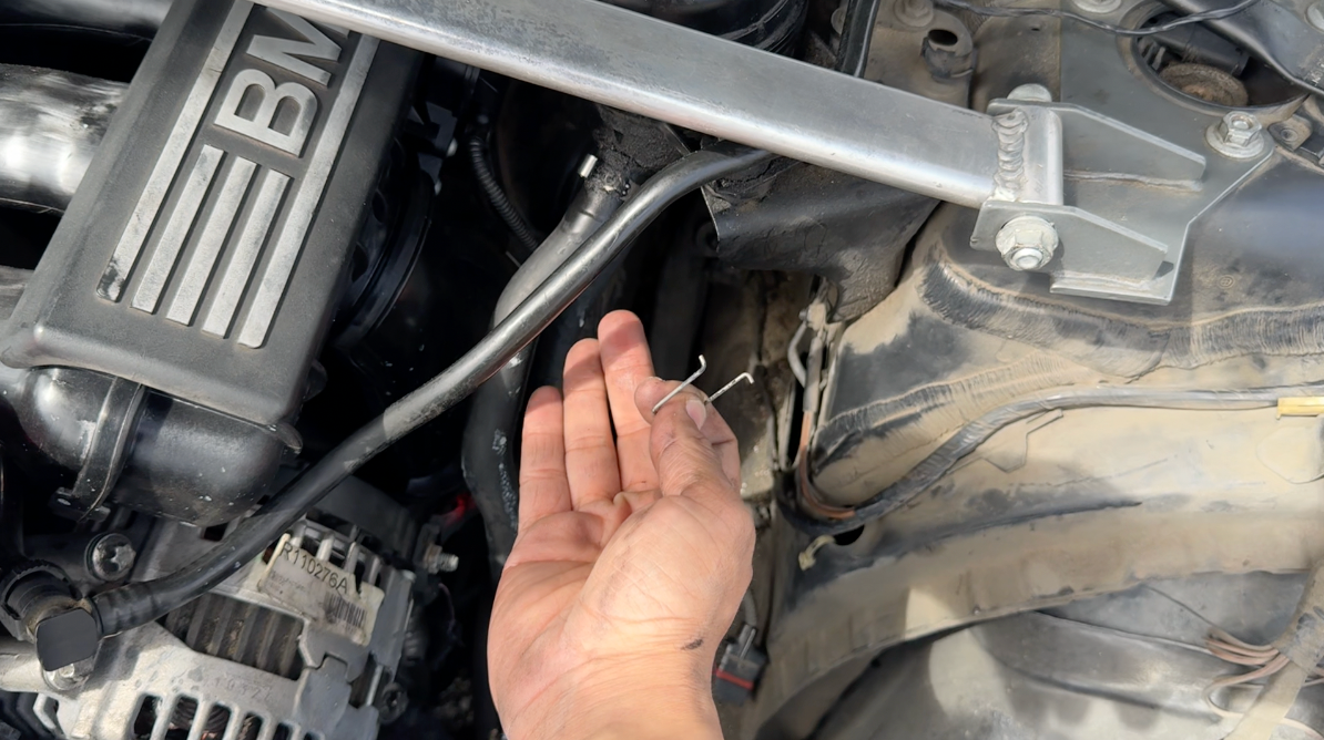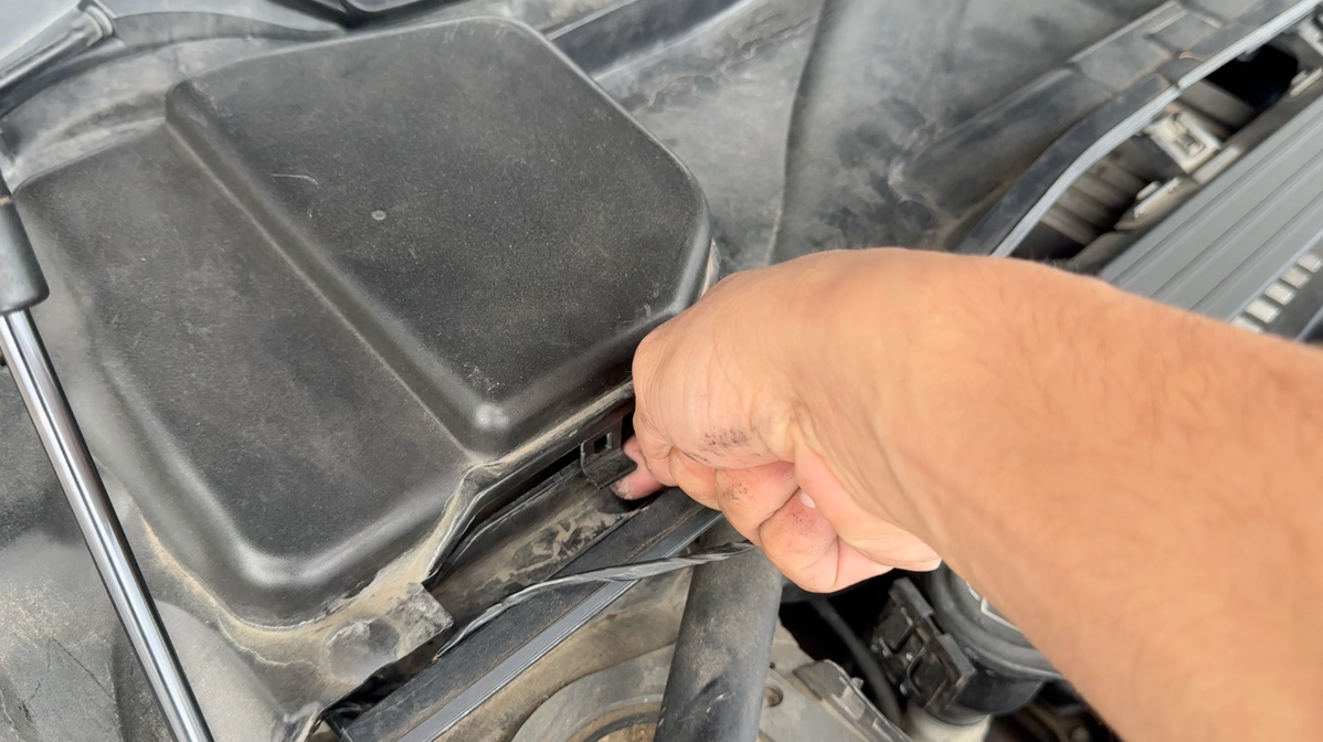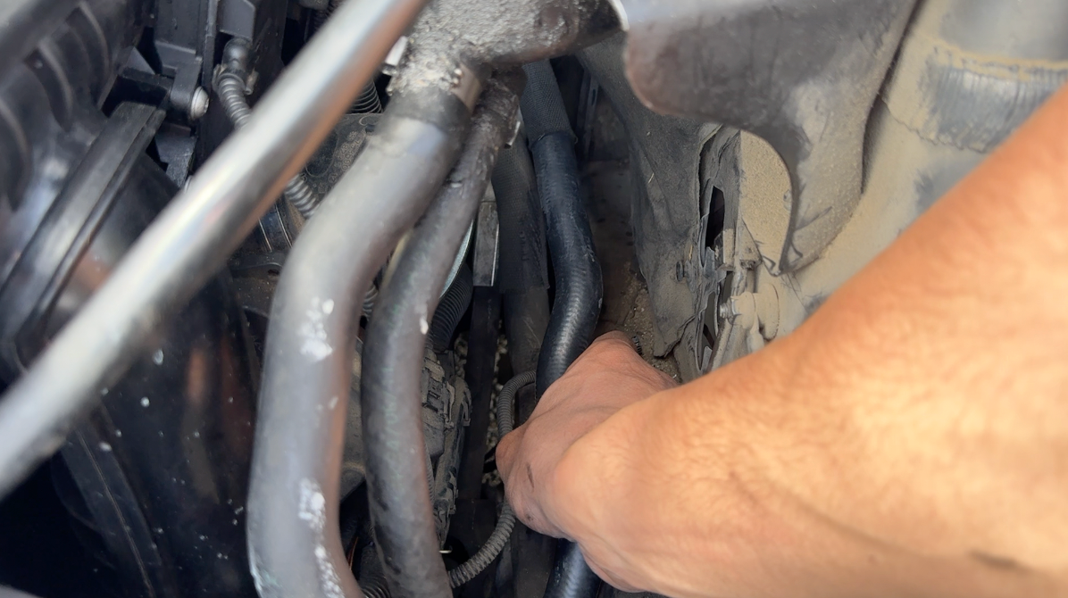 To make install of the new hose easier, pull the retention clip to the unlocked position so you can simply slide it into place, in the engine bay.