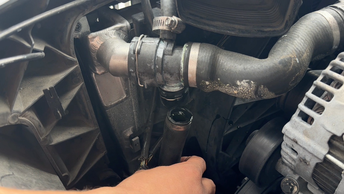 Remove the heater hose from the upper radiator hose by gently but firmly pulling it back and forth, until it comes off.