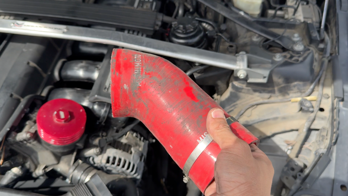 Loosen the band clamp that holds the air intake hose to the throttle body, with a flathead screwdriver.
