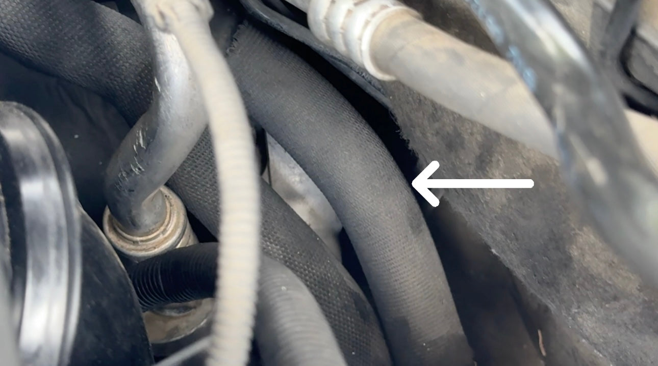 There are two coolant hoses routed to the heater core. The hose we are replacing is the one to the right (white arrow), not left.