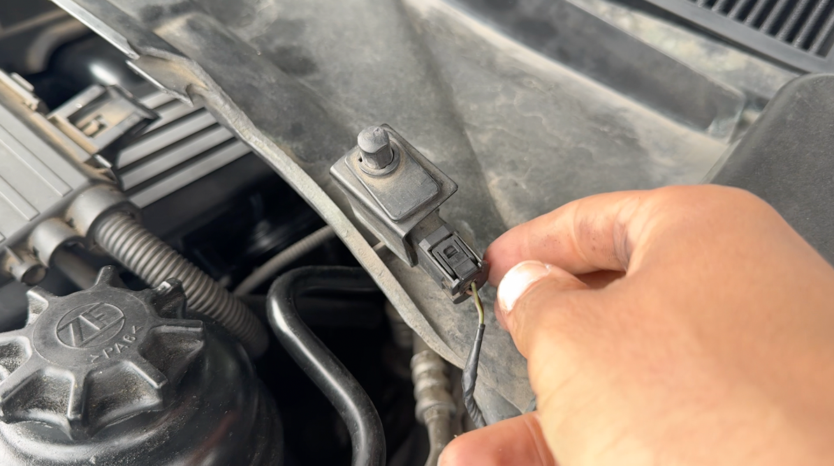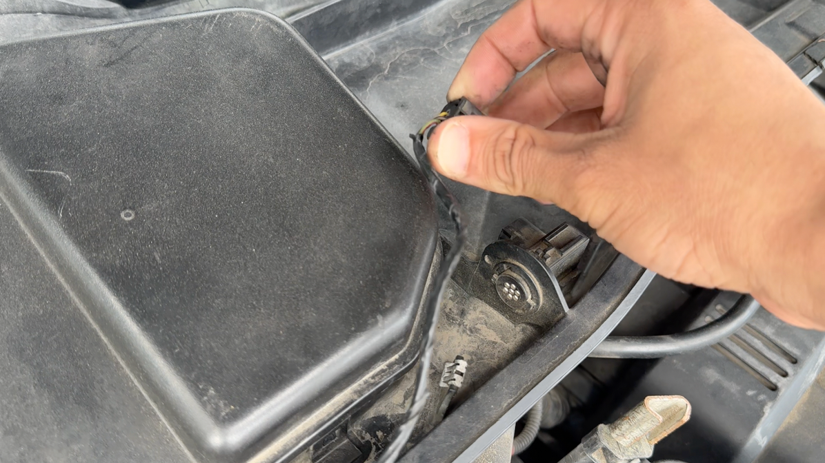 Remove the first cowl connector by pressing down on the retention clip and pulling the connector off of the sensor.