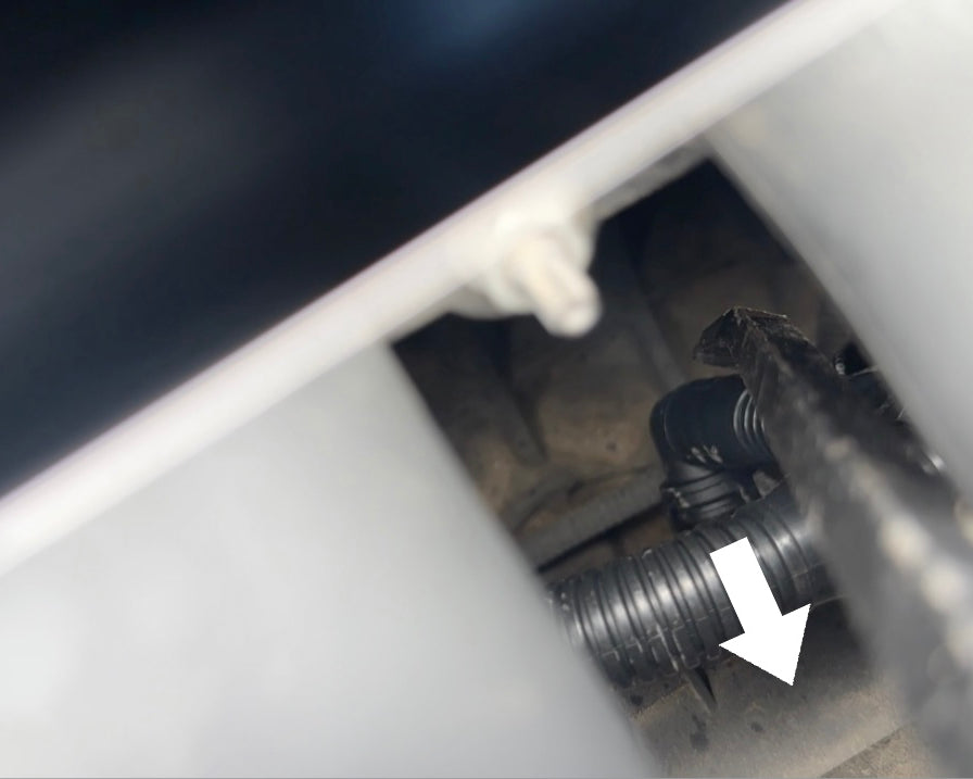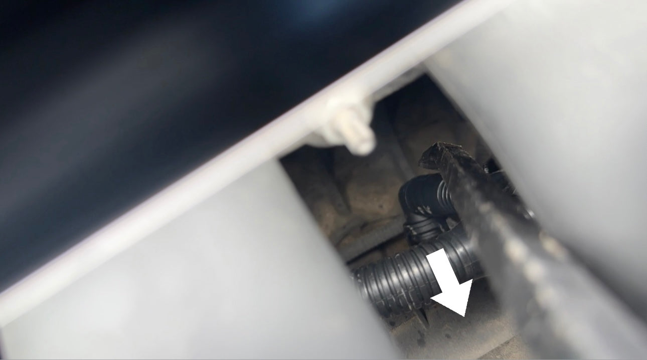 Using the same metal pry tool, leverage the thicker [non-ribbed] plastic portion of the hose in the direction of the white arrow, until the hose can audibly be heard snapping into place. Gently pull on the hose to ensure it's fitted and doesn't pop off.