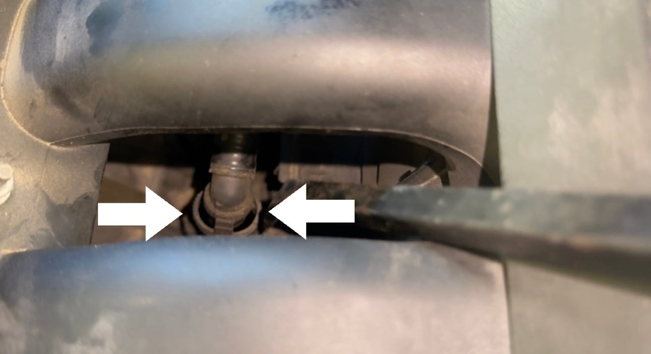 Using a metal pry bar in the same way, pry against the push clips on either side (white arrow). If a pry bar cant reach the tabs, use a flathead screwdriver and hammer to break the tabs off of the hose side. Again, take care not to damage the intake manifold side of the connecting point.