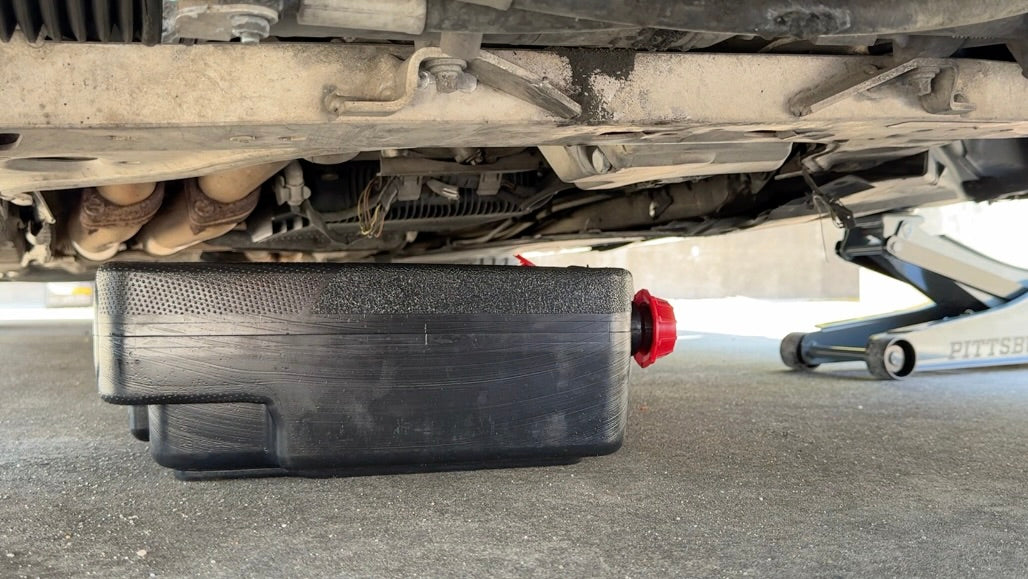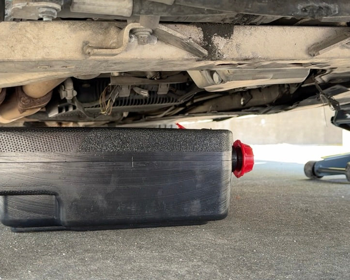 Position drain pan underneath the vehicle's oil pan. Ensure it's placed so the motor oil will flow into it and not miss.