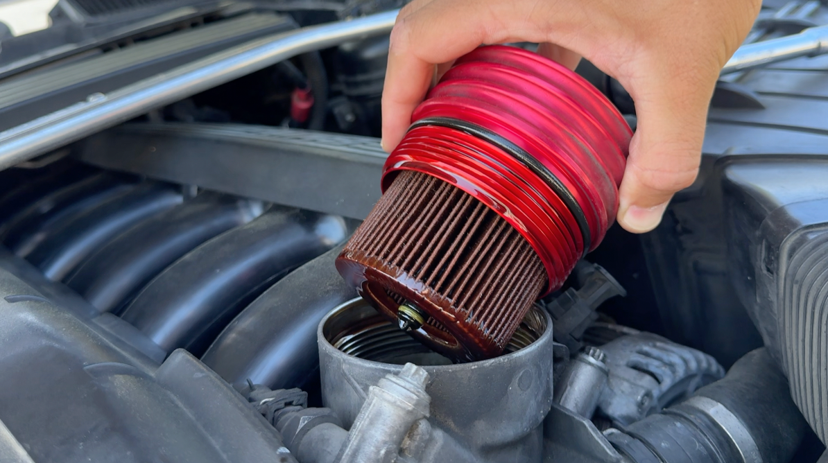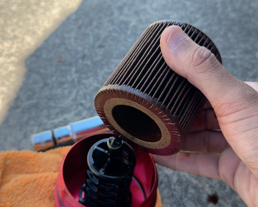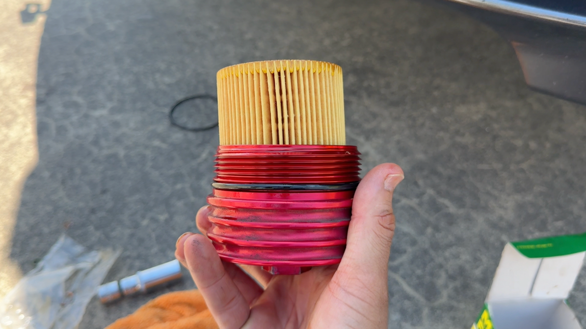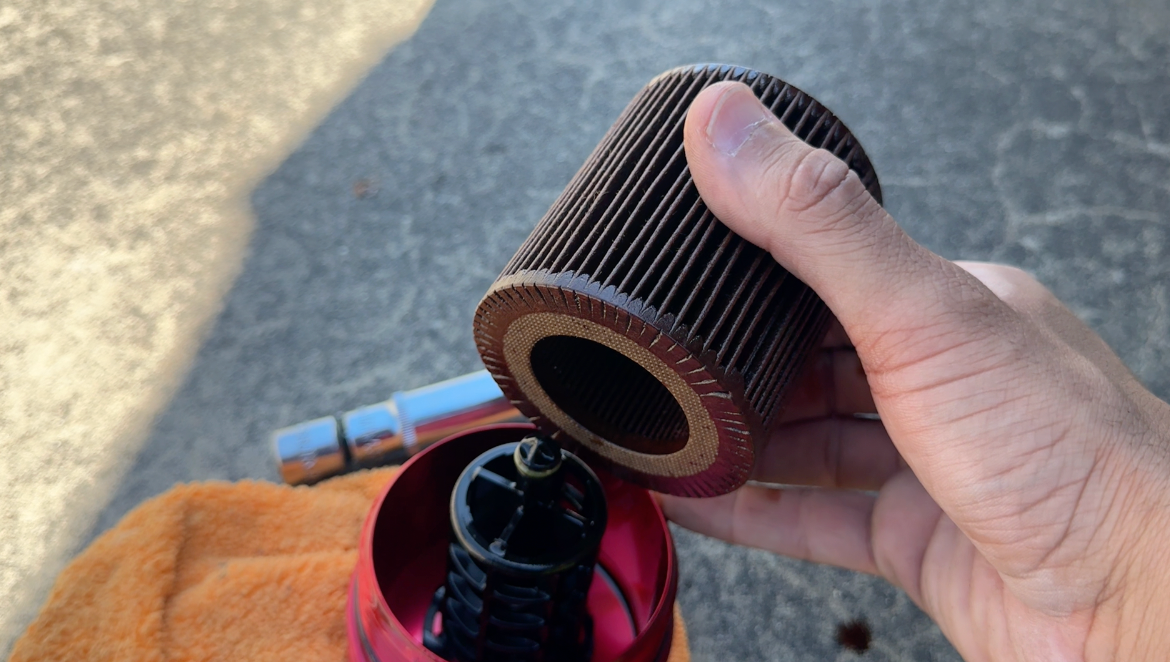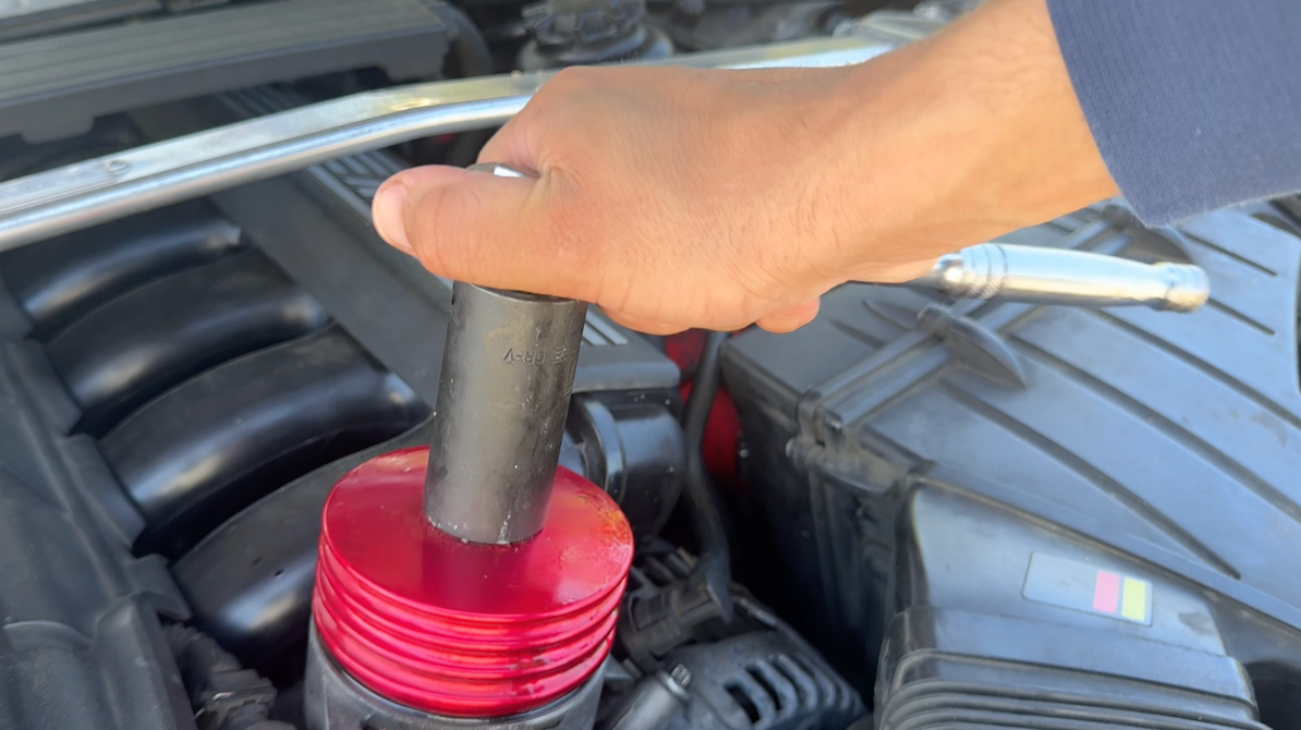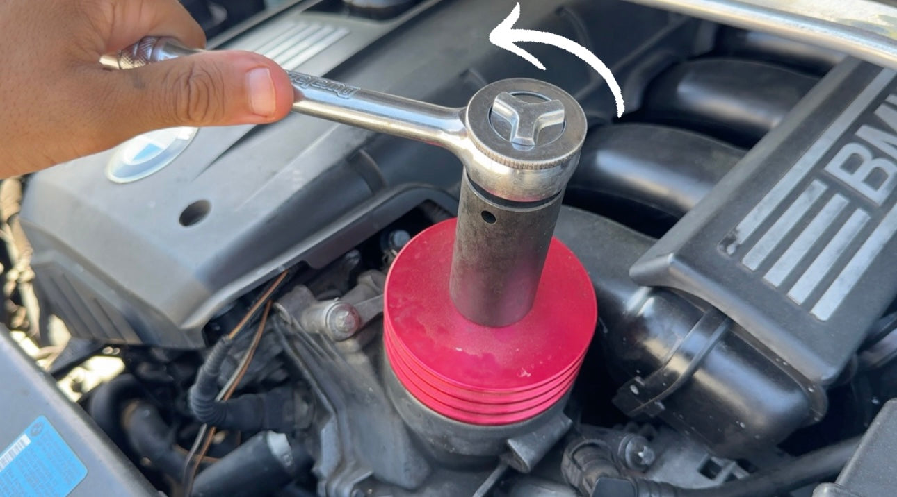 Loosen the oil filter cap using the oil filter cap removal tool or 27MM wrench, depending which oil filter cap you have installed.