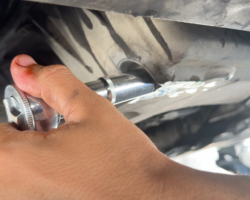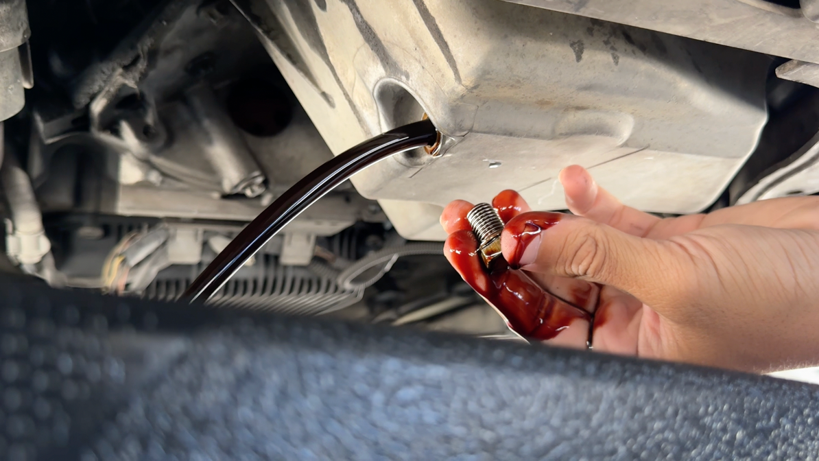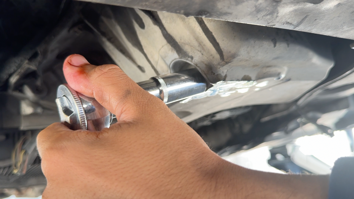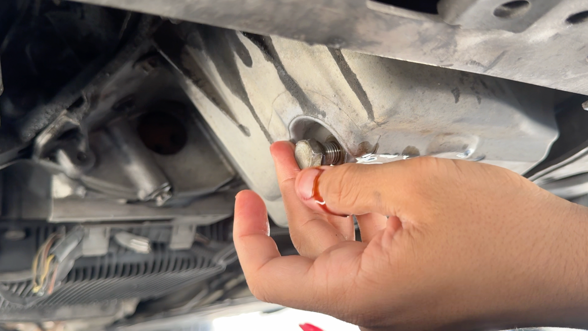 Continue to hand-thread the oil plug out of the pan until it's completely removed and oil starts to pour out.