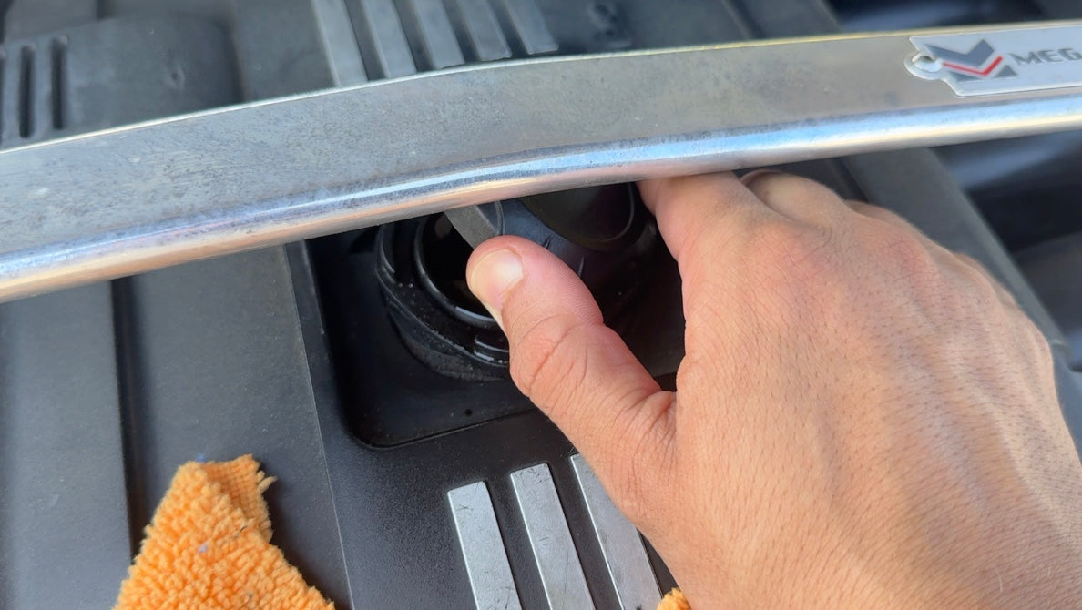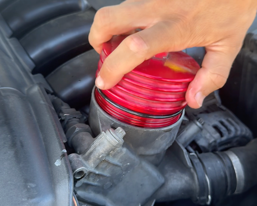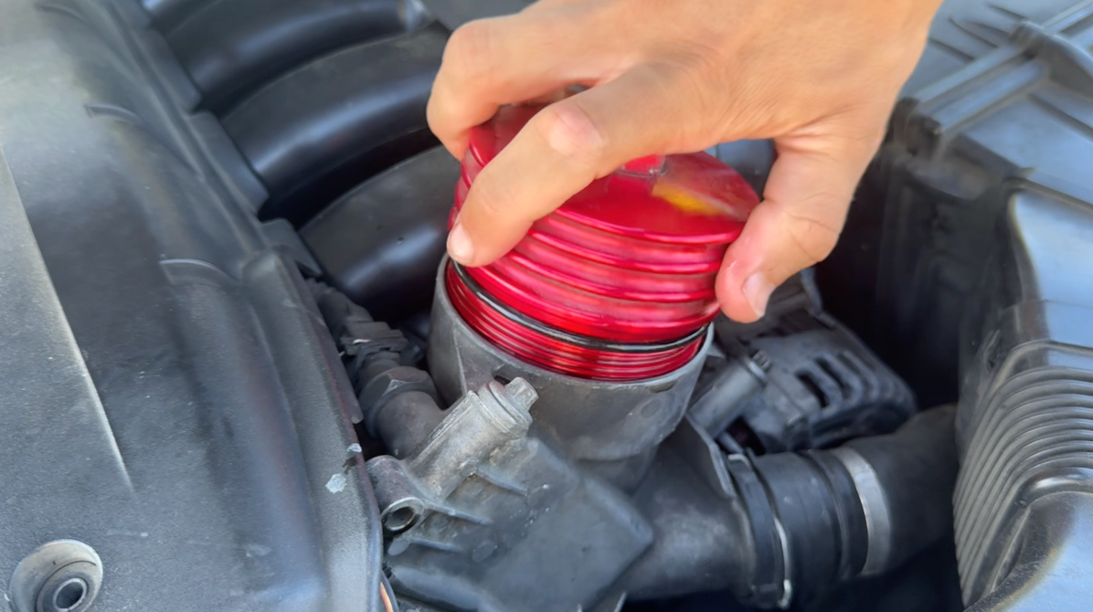 Re-install the oil cap by pressing it down into place and twisting it clockwise until it's fully flush.