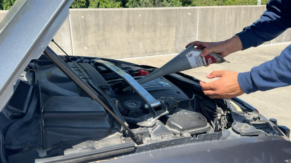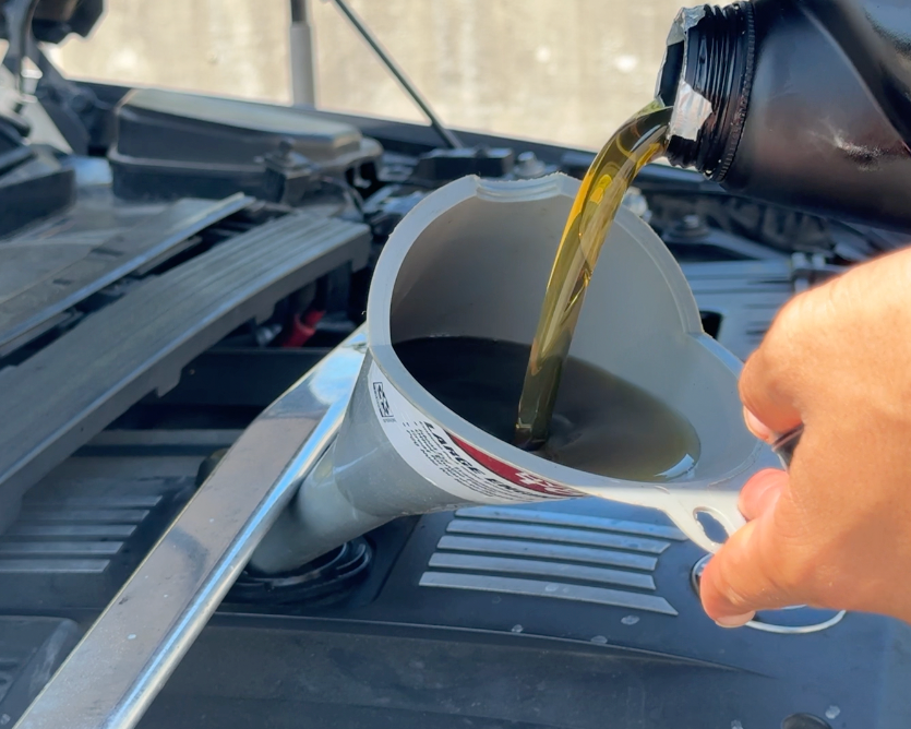 Add 6.5 quarts of full-synthetic oil to your engine. Since an additive was added in the prior step, we will subtract that amount from the 6.5 quarts needed.