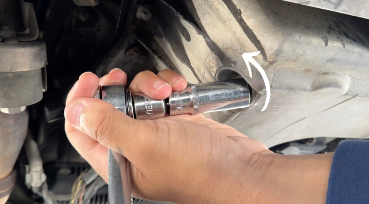 Loosen the oil pan plug by rotating the 17MM socket and ratchet counter-clockwise (direction of the white arrow).