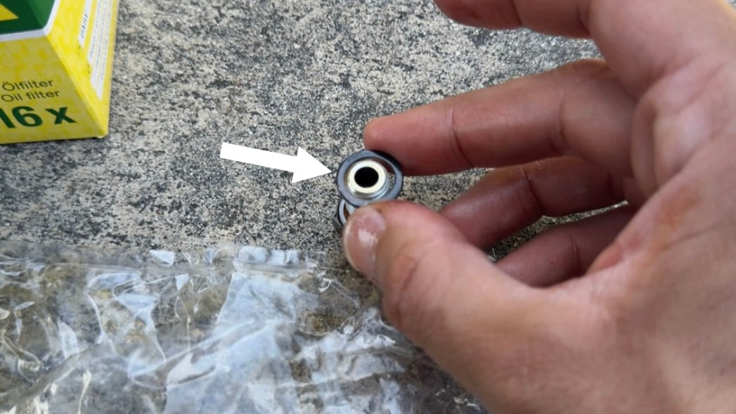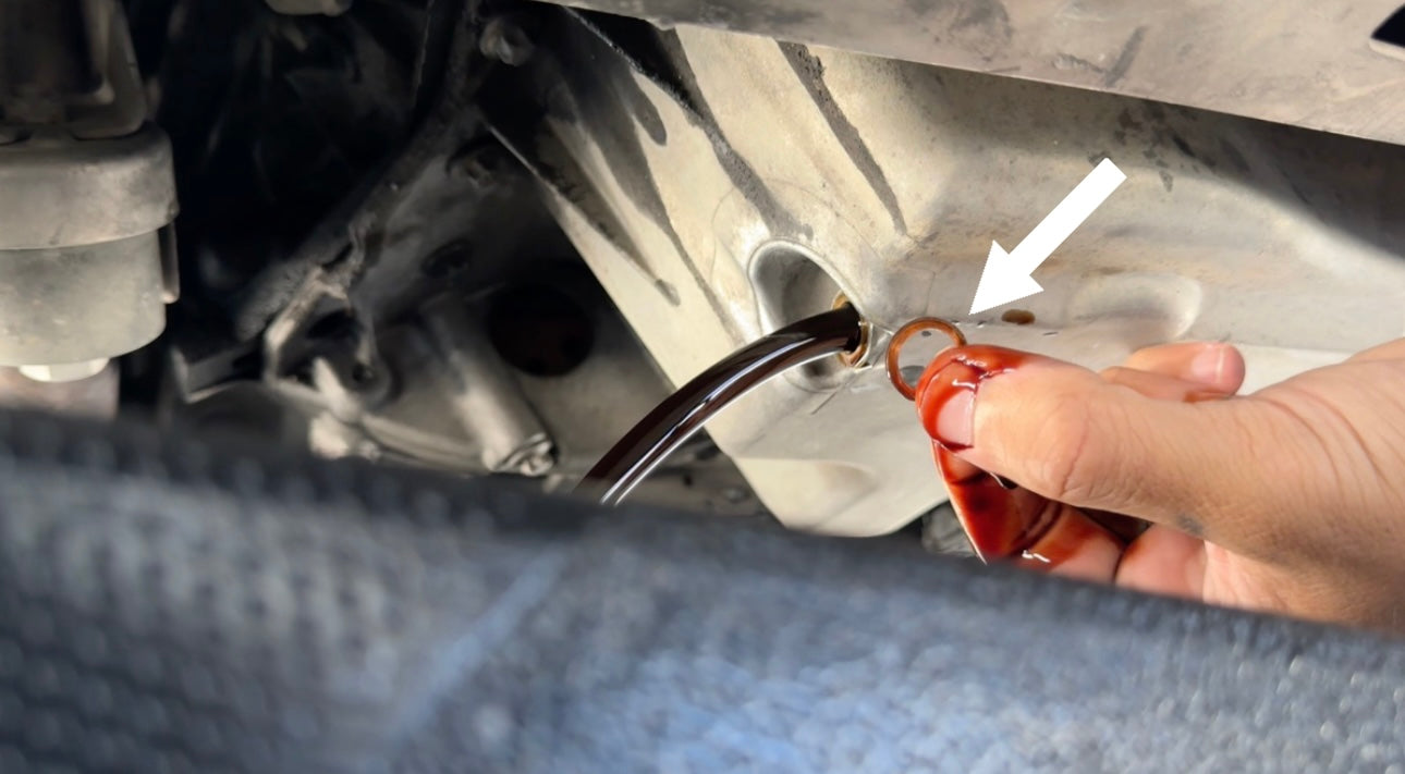 Ensure the metal oil plug crush washer (white arrow) is fully removed from the pan. This washer can stick to the oil pan over time, appearing to be removed when it's not.