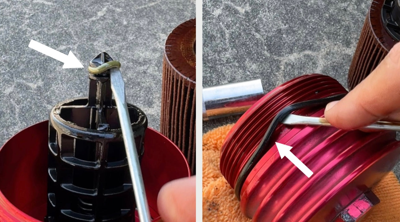 Remove and replace the two oil filter cap gaskets using a flathead screwdriver.