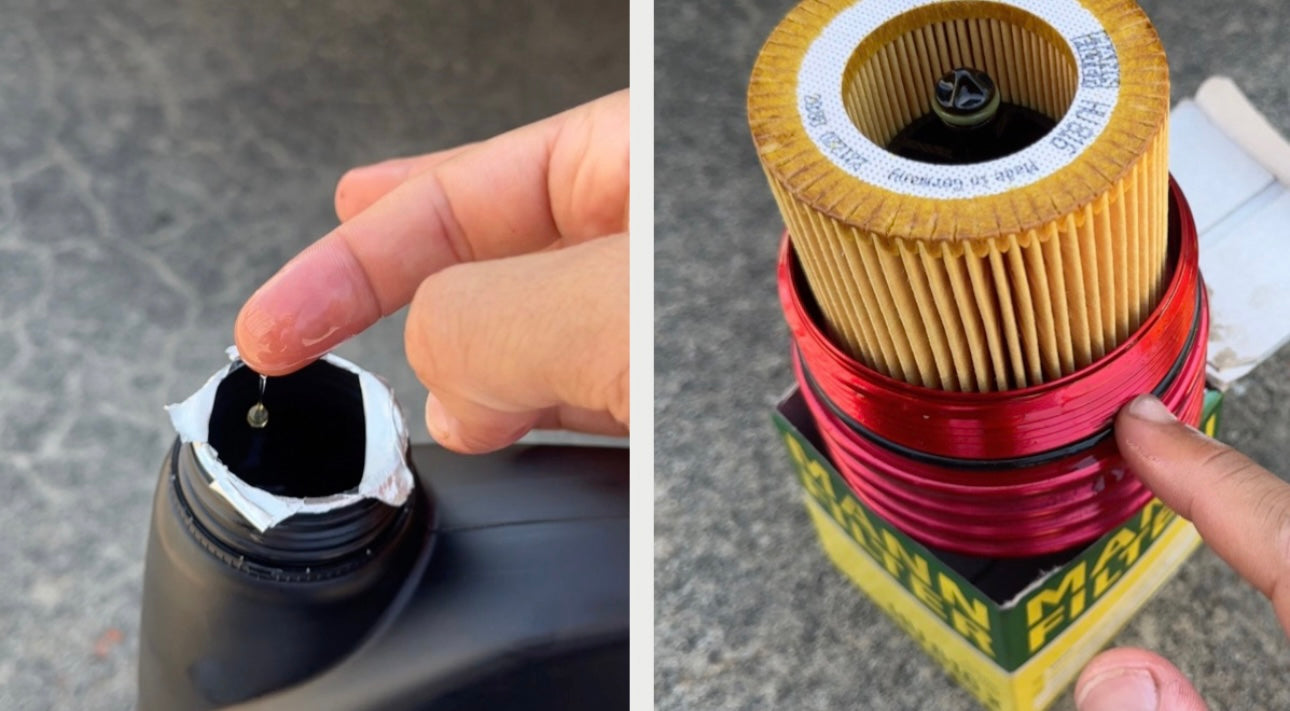 To ensure a tight fit of the new oil filter, lubricate the two new gaskets by spreading a thin layer of new oil over them.