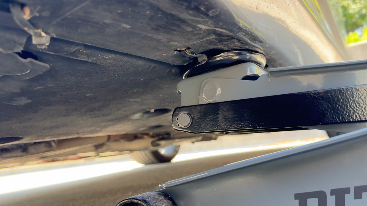 Try positioning the floor jack onto the jack pad so it does not bend the side skirt (as seen above).
