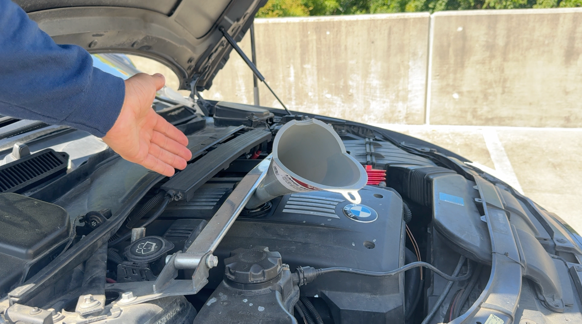 Remove the funnel, ensuring oil doesn't spill in the engine bay.