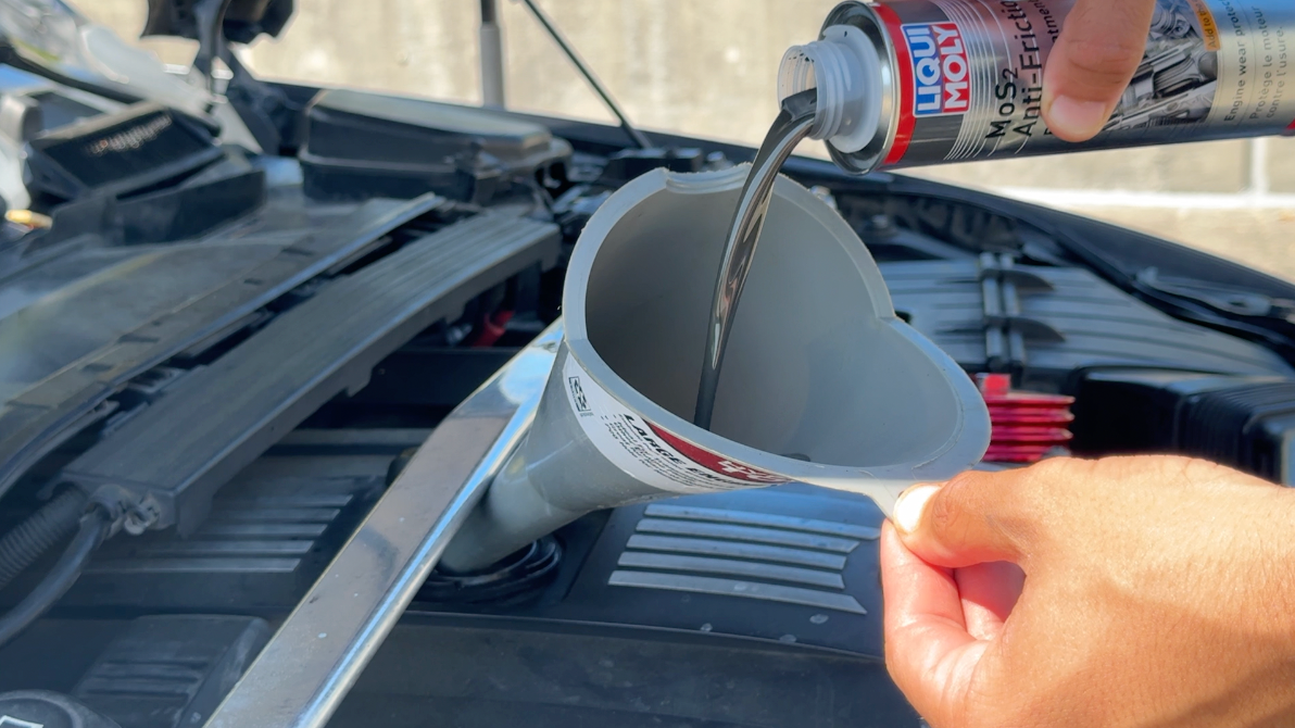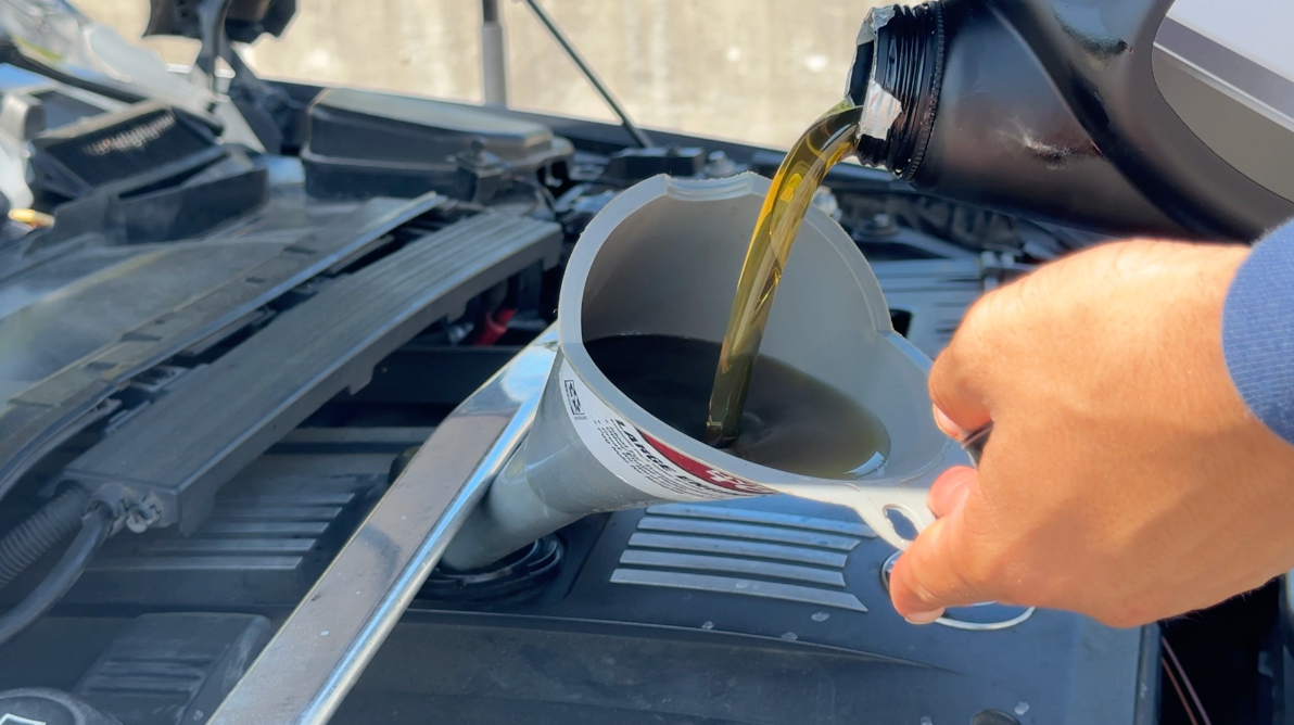 Using a funnel is highly recommended when filling up on oil, to avoid spillage that could drip onto electronics, or create fumes.