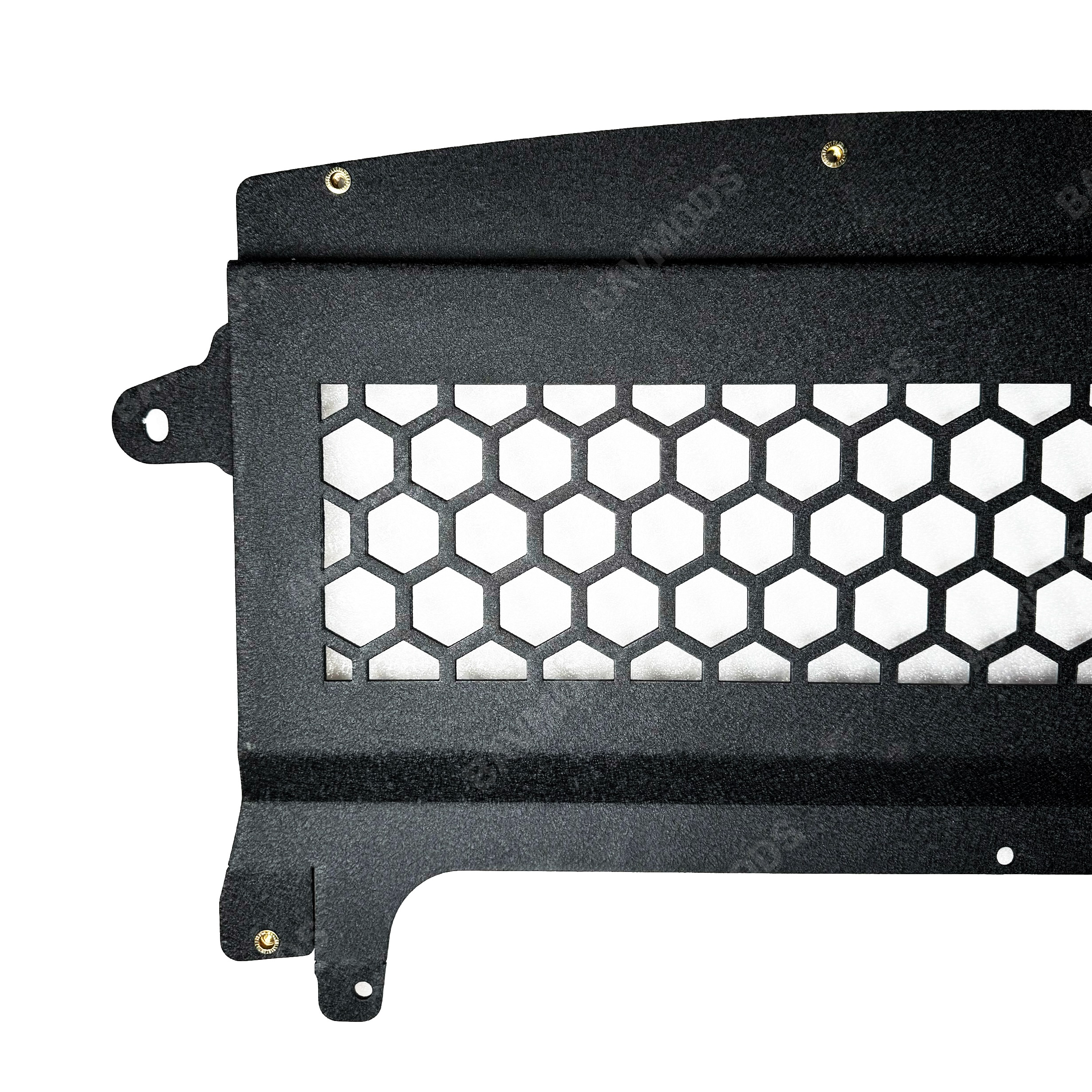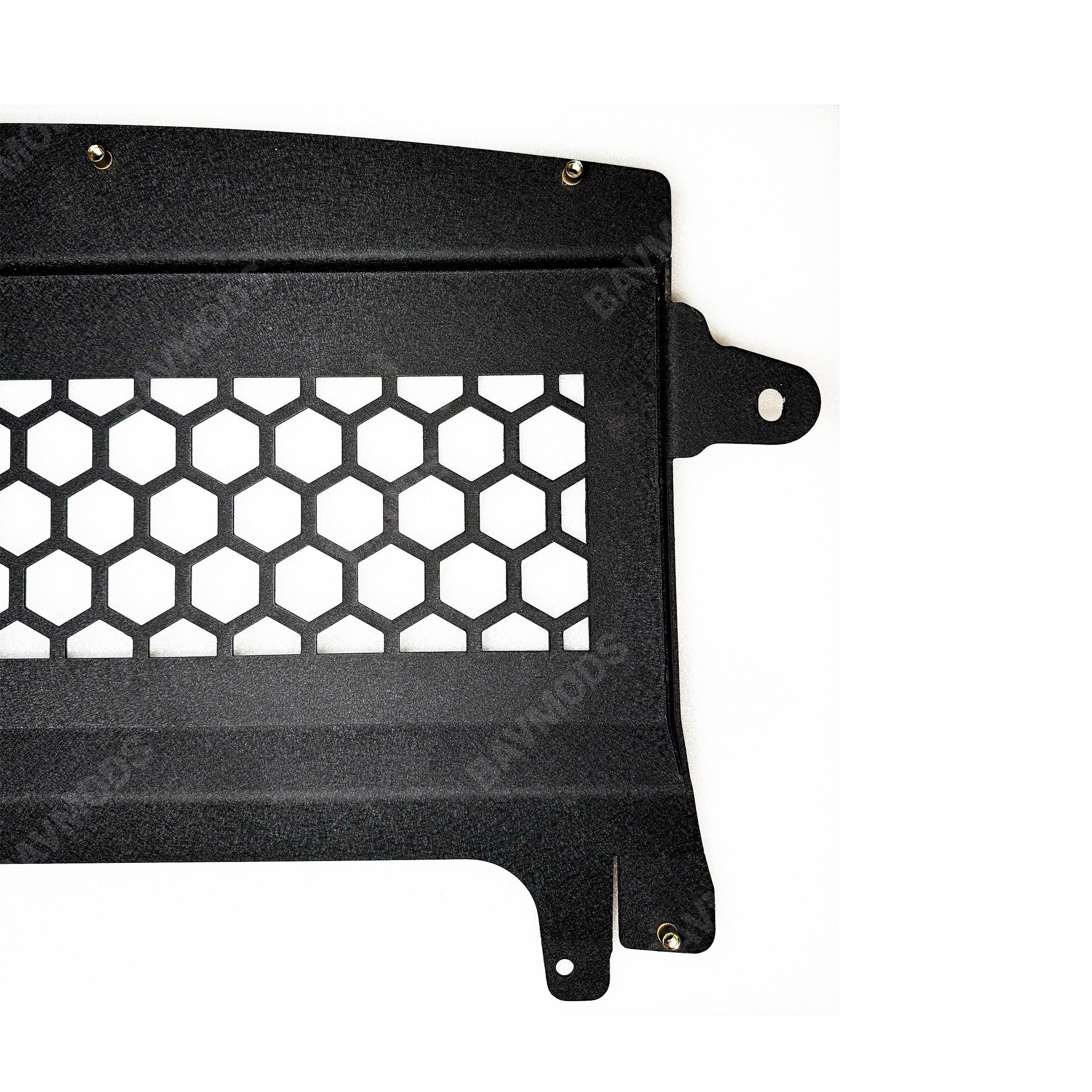 Protect your oil cooler from damage caused by debris, rocks, and other road hazards with our direct-fit upgraded aluminum skid tray. Built for durability and performance, this skid plate features large hexagonal cutouts to maintain optimal airflow while shielding the oil cooler from potential harm, such as tire debris or large rocks.