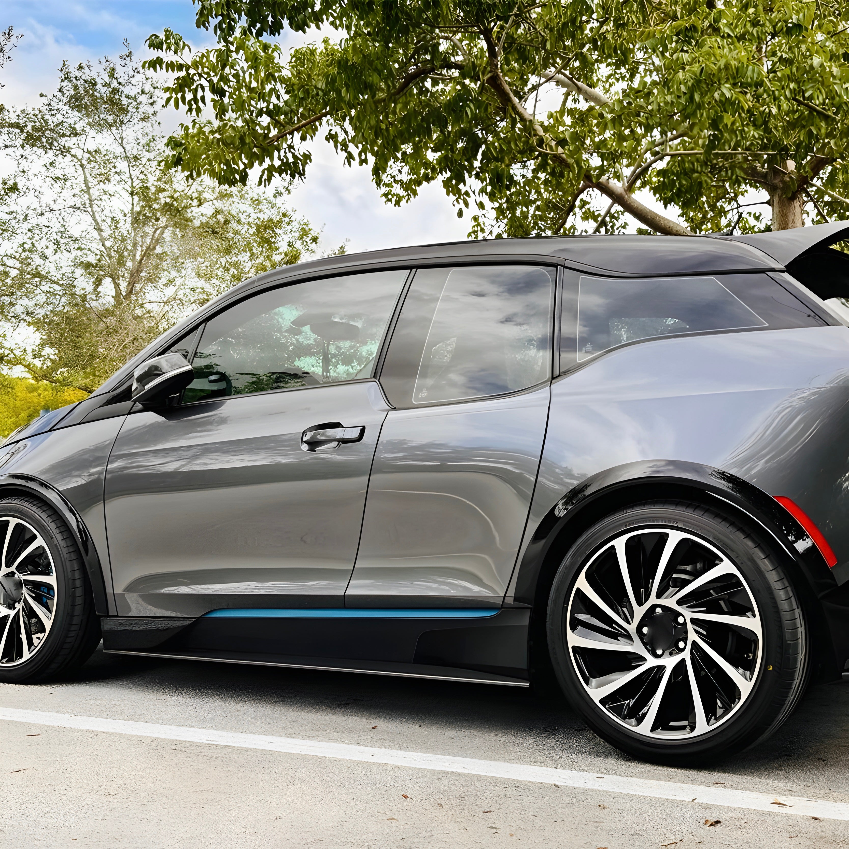 Featuring a flat-contoured profile that subtly flares outward, these extensions create a visually lower, wider aesthetic that hugs the ground — improving both style and aerodynamic stability. The result is a modern, track-inspired silhouette that amplifies the i3’s unique design while adding genuine downforce benefits.