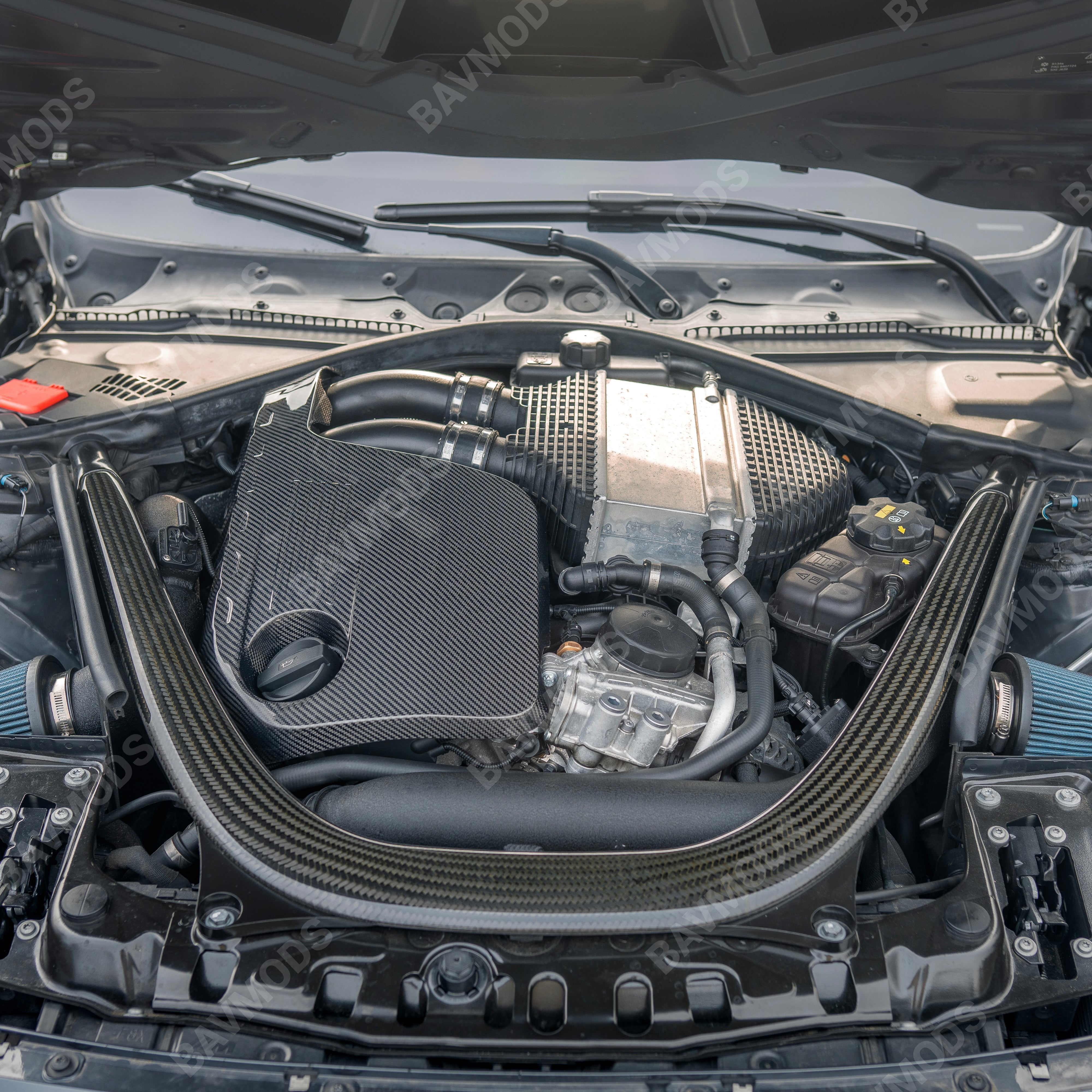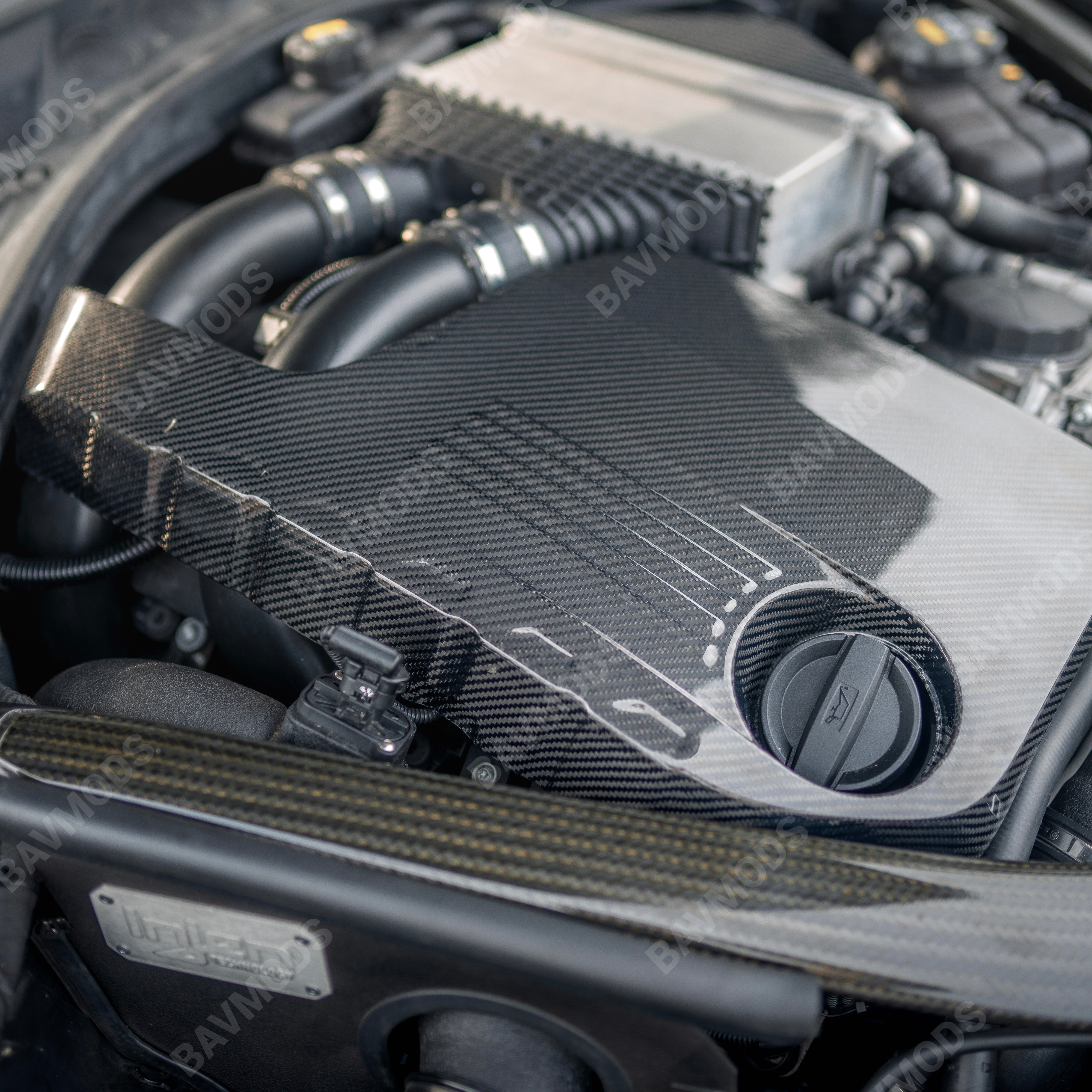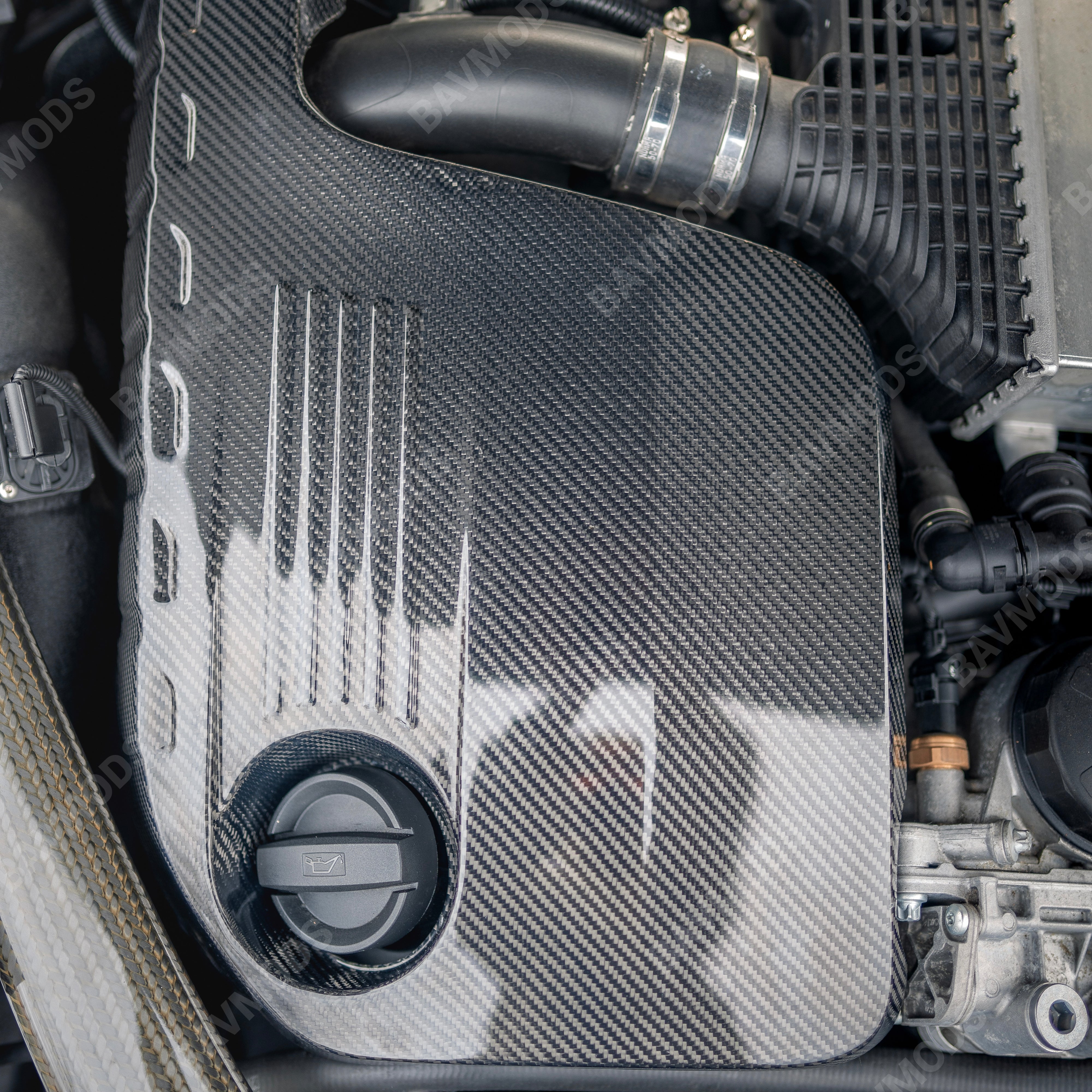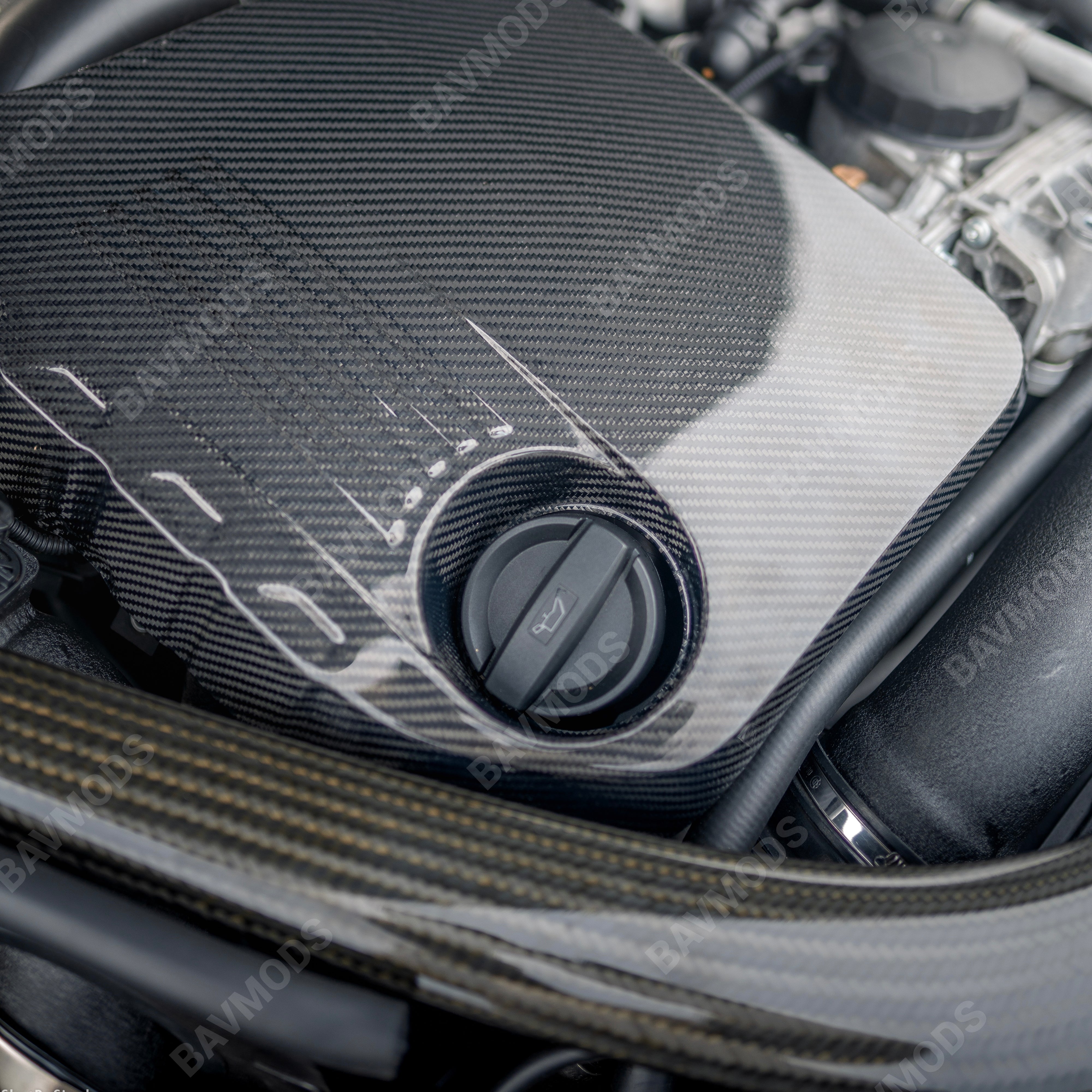 Unleash the full potential of your BMW M with our authentic twill carbon fiber engine cover for the S55 engine.