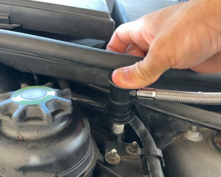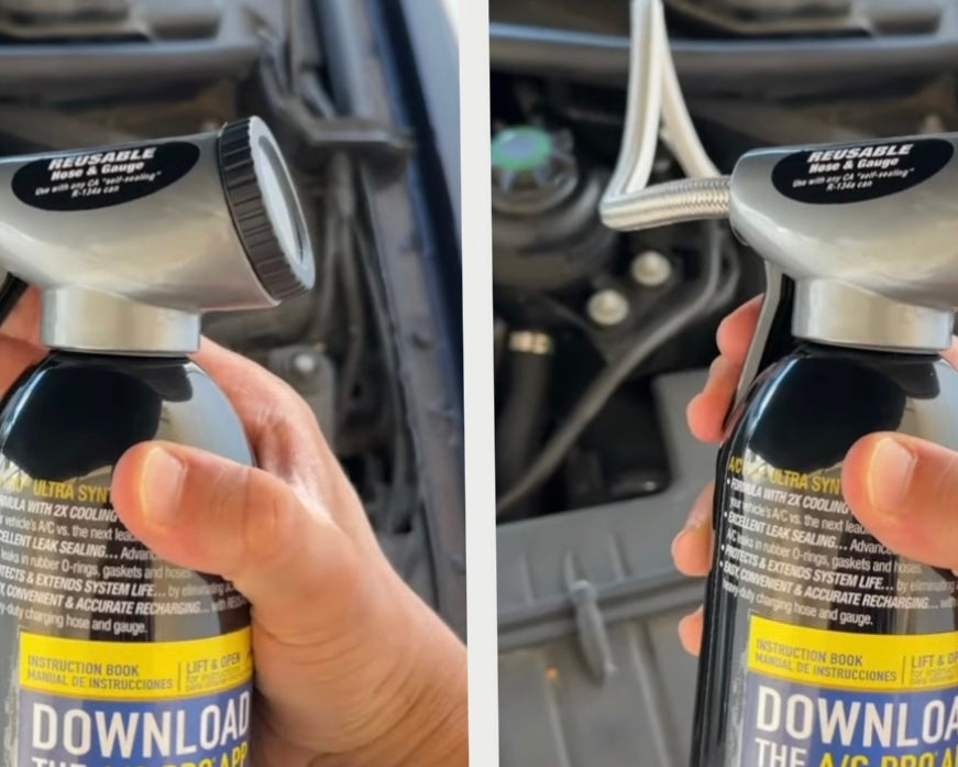 Attach the R-134A freon canister hose to the vehicle's low pressure port. Ensure the hose snaps firmly into place.