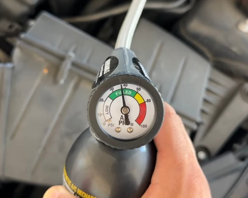 Continue to recharge the AC system until the gauge reads roughly 35PSI. Do not fill AC to 40+ PSI.