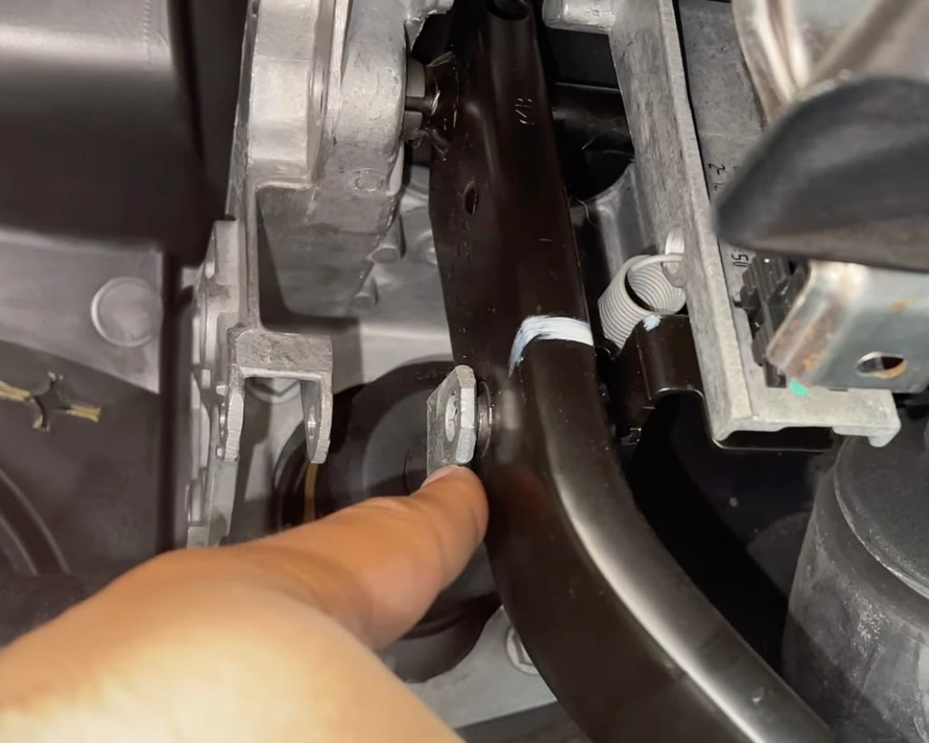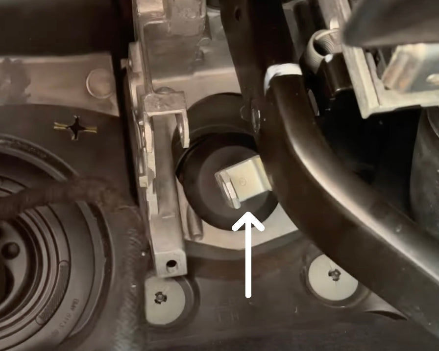 Reinstall the metal brake pedal pin (white arrow) so it feeds all of the way through the pedal and brake booster knuckle.