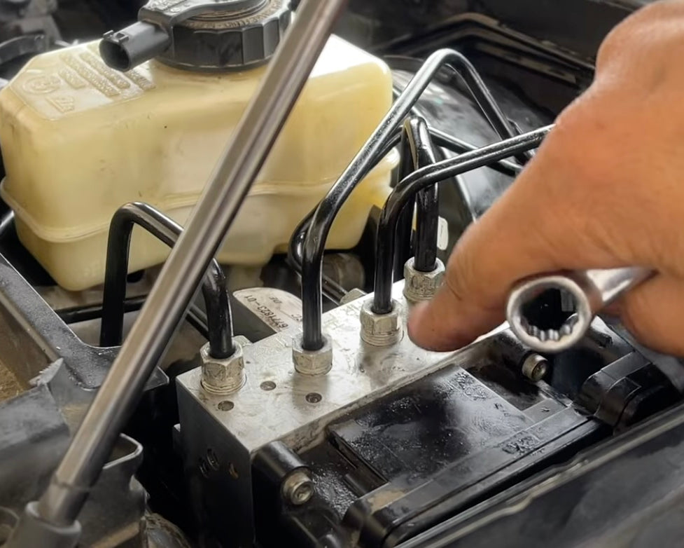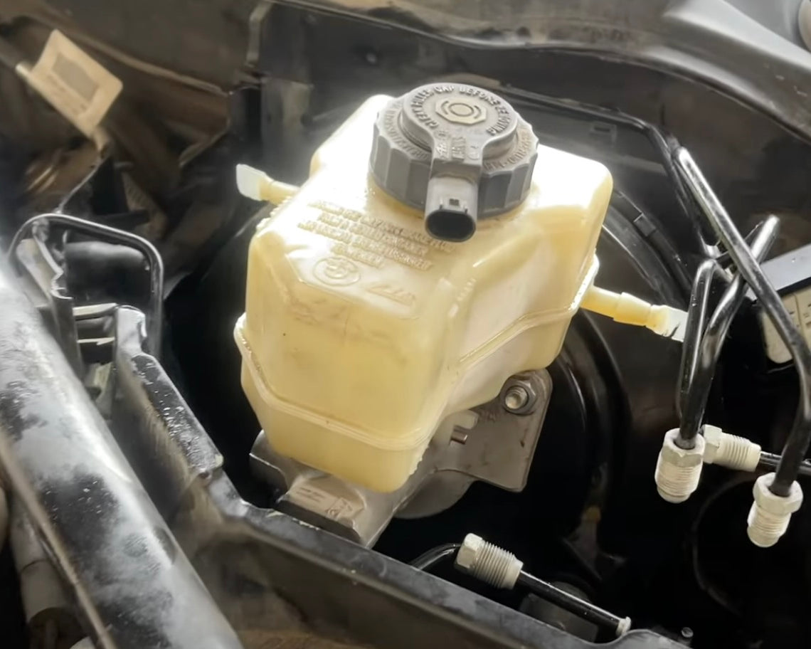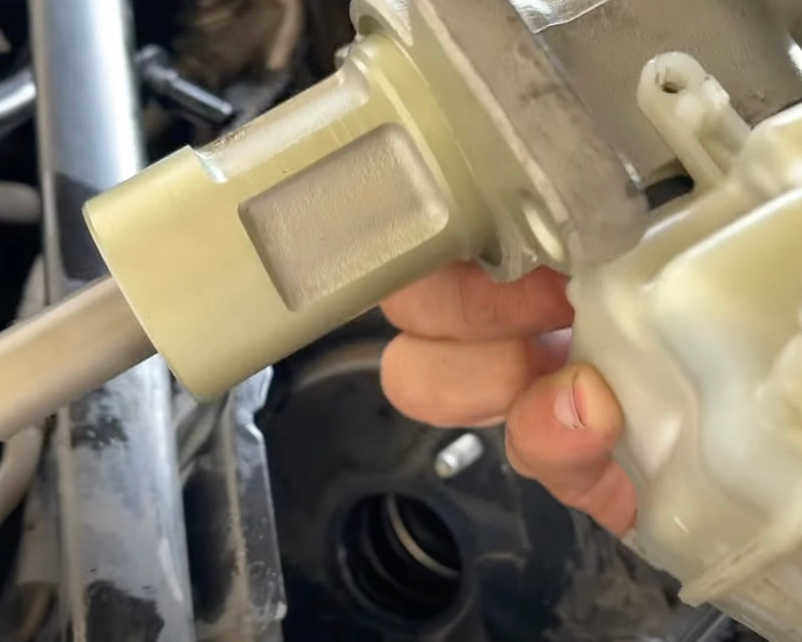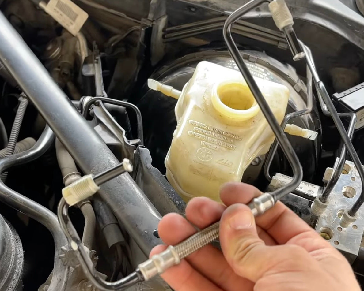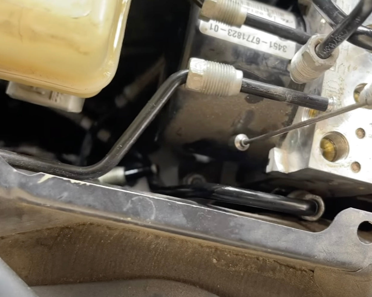 Reinstall the lower brake fluid line that connects to the master cylinder. Ensure you tighten down the end that connects to the cylinder itself also.