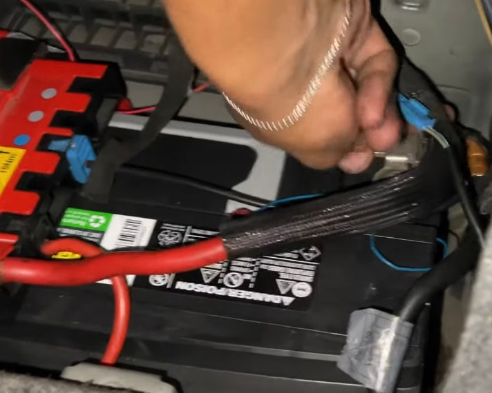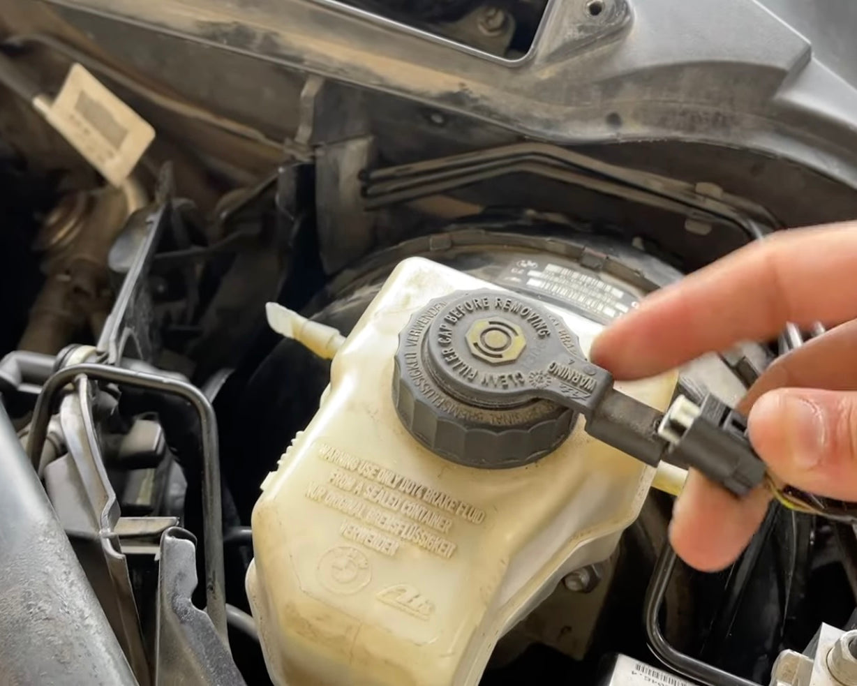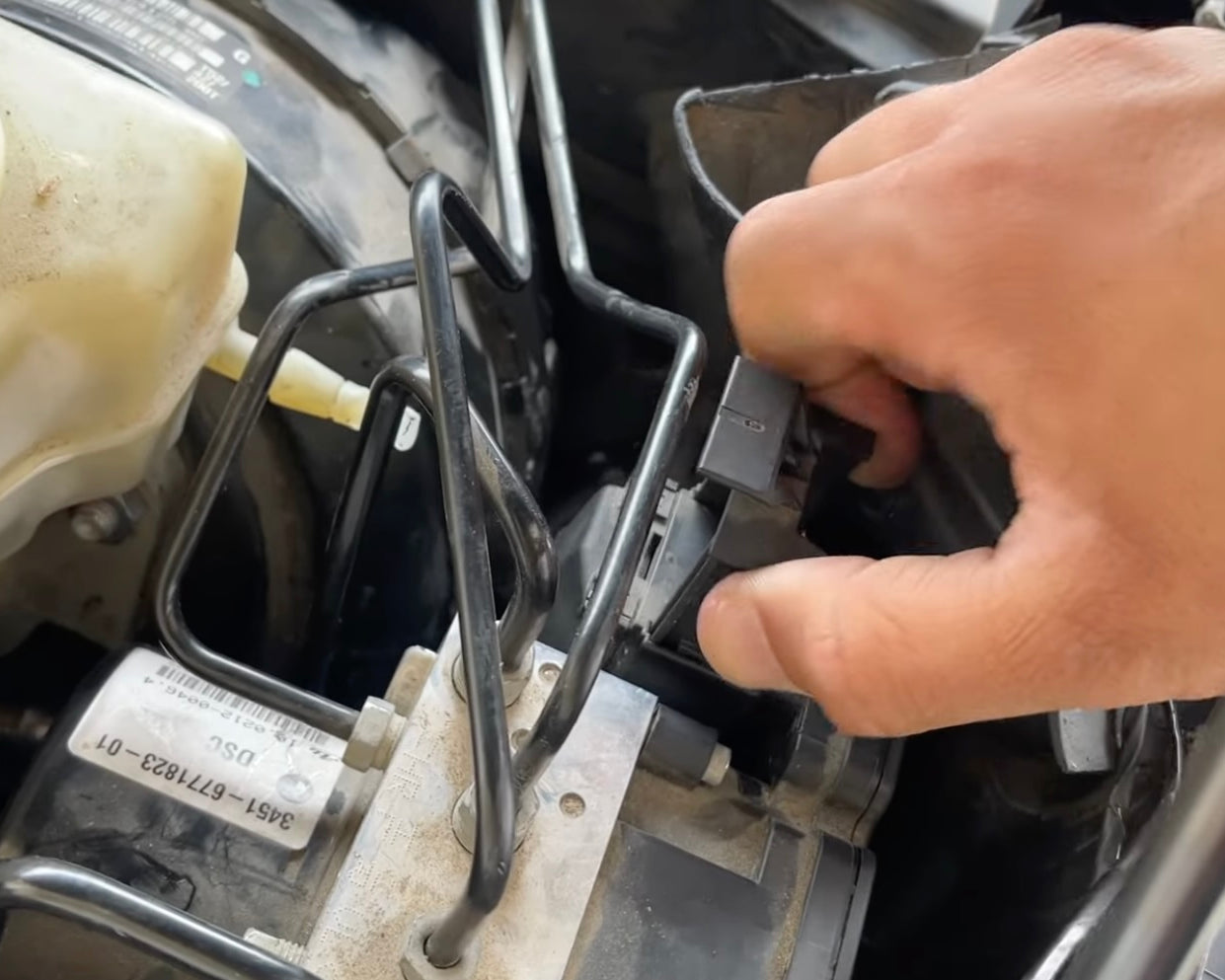 Unplug the brake reservoir connector by depressing the retention tab and pulling it back.