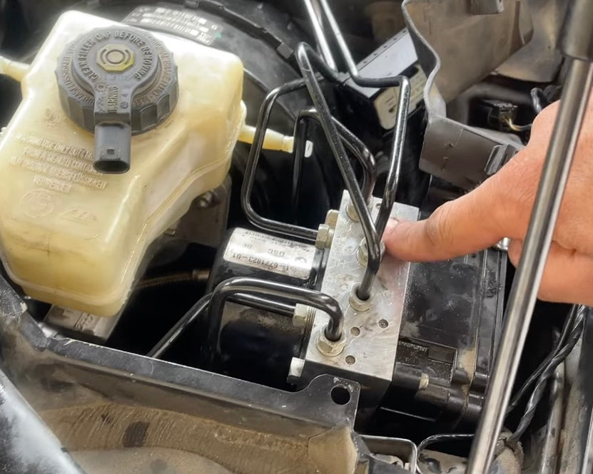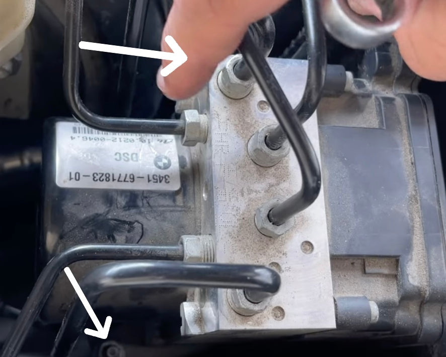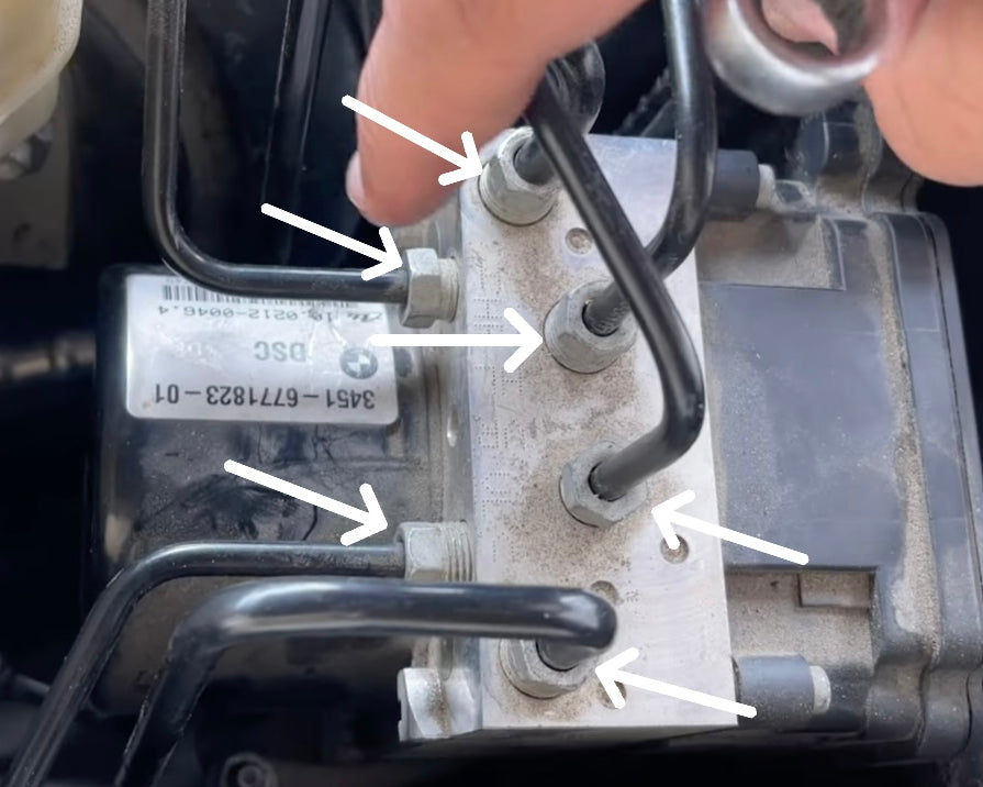 Loosen the six 11MM brake fluid lines (white arrows) that attach to the top of the DSC module and disconnect them. You do not need to remove them completely from the vehicle, just remove the DSC connecting point.