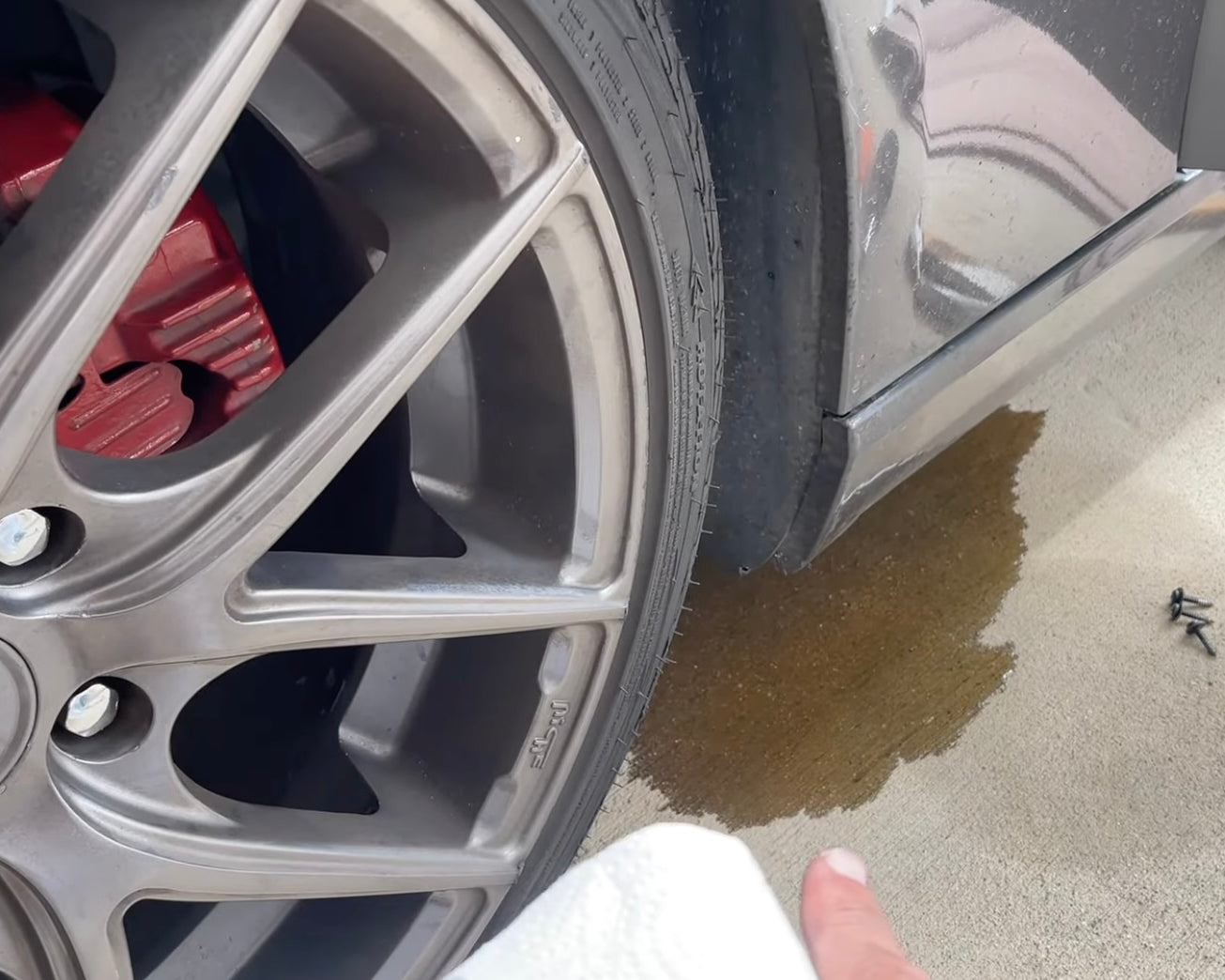 When disconnecting the bottom brake fluid lines from the master cylinder, brake fluid will leak down the drain port at the driver-side wheel. Put some paper towels into place to avoid chemical stains.