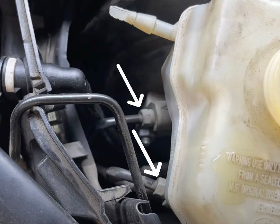 Loosen and disconnect the two 11MM brake fluid lines that connect to the master cylinder down below (white arrows).