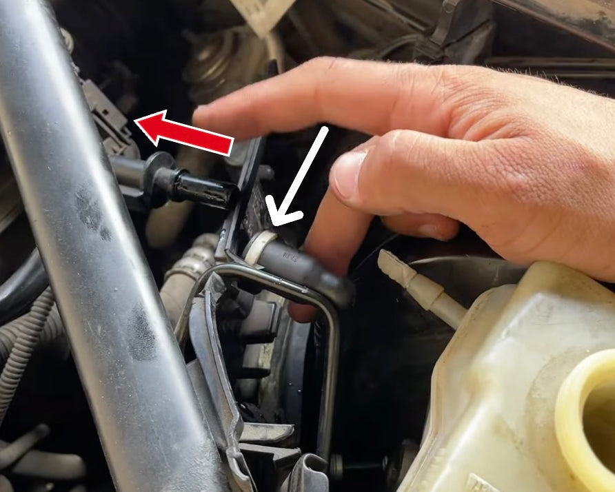 Disconnect the brake booster vacuum line pictured by depressing the white retention clip downwards (white arrow), while pulling the male end backwards towards the red arrow.