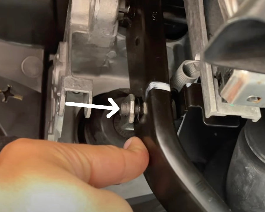 With the brake booster nuts completely removed, wiggle the knuckle (white arrow) off of the brake pedal assembly.