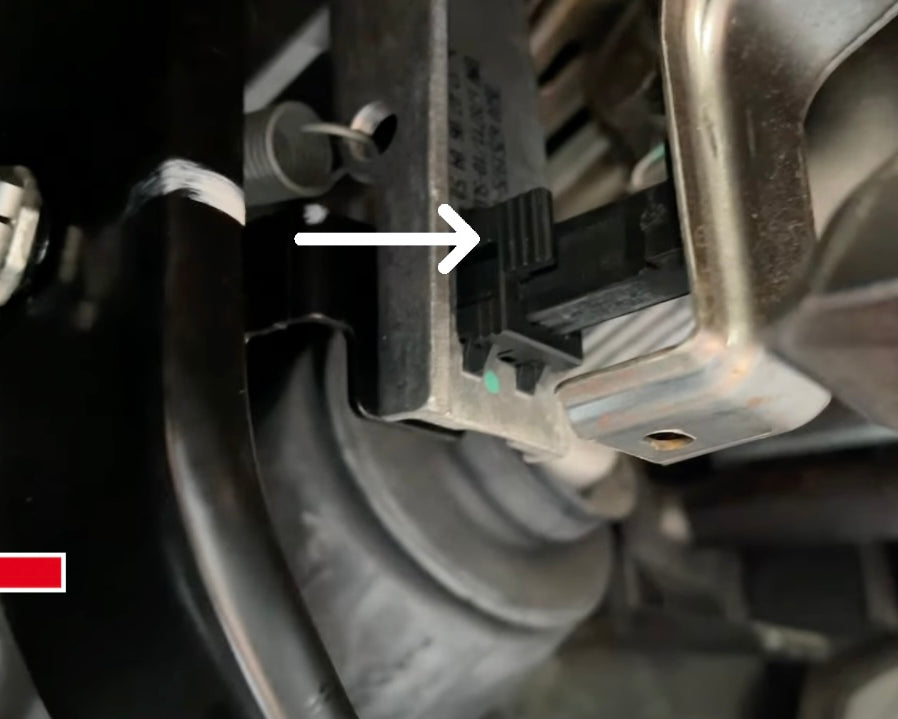 After replacing the brake booster, you may have trouble starting the vehicle. This is because the brake sensor needs to be reset. To reset the brake sensor, press the brake pedal all of the way down in the direction of the red arrow, then while holding it down, press the two retention tabs on the brake sensor (white arrow) and push the sensor all of the way down. After the sensor is pushed all of the way down, let go of it then let go of the brake pedal. The brake pedal should press against the sensor and reset it to the factory position. Press here and fast-forward to 15:29 for a visual.