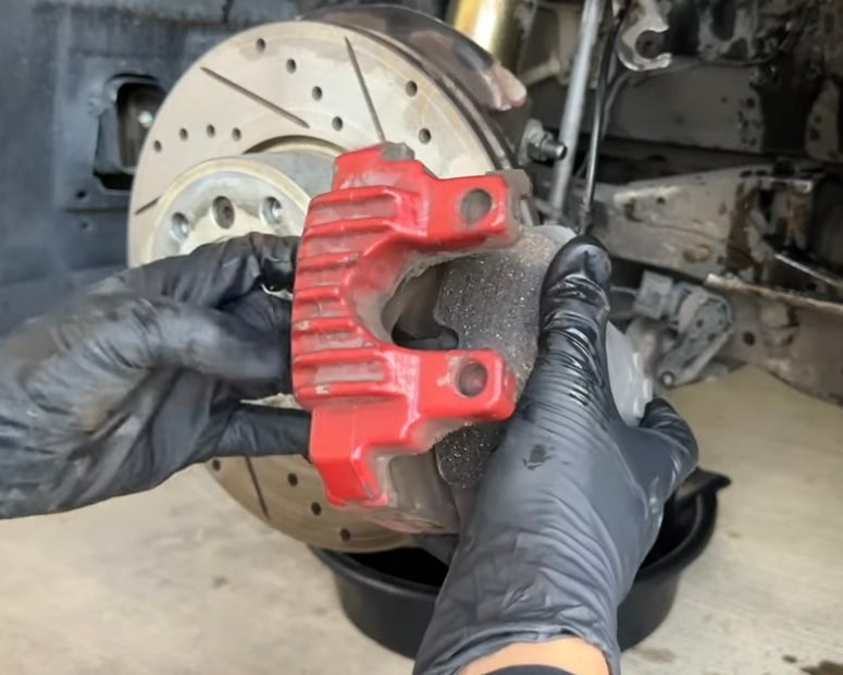 Loosen the 2 brake caliper sliding pins using a 7MM allen socket. This will allow loosen the caliper body off of the caliper bracket.