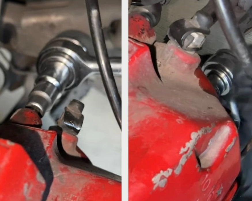 Remove the 2 18MM brake caliper bolts located to the rear. One bolt will be on top (left picture) and one on bottom (right picture).