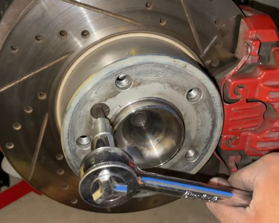 Remove the brake rotor retention screw using a 6MM allen socket. You will need to grab and hold the rotor with one hand while applying force on the ratchet with the other hand. Keep your fingers away from the bottom side of the rotor in case car falls from floor jack.