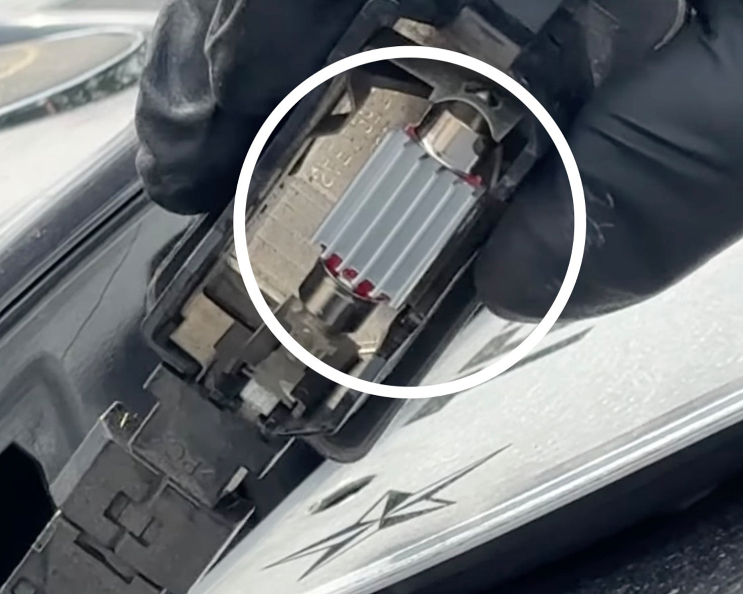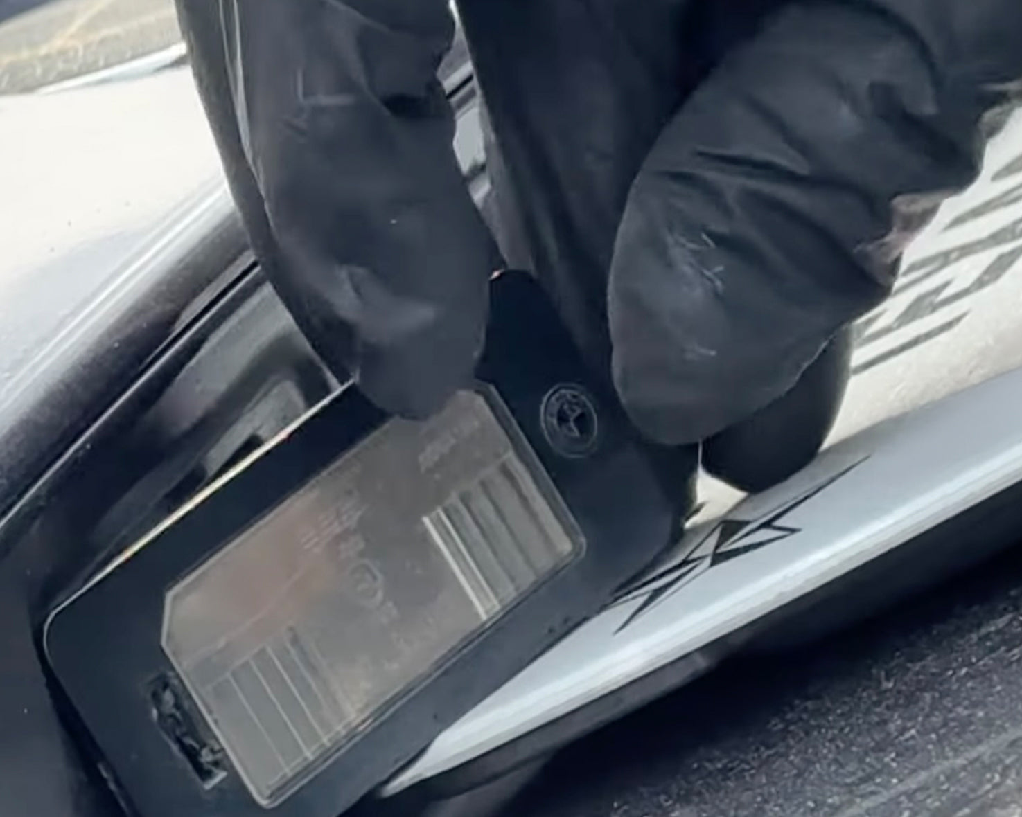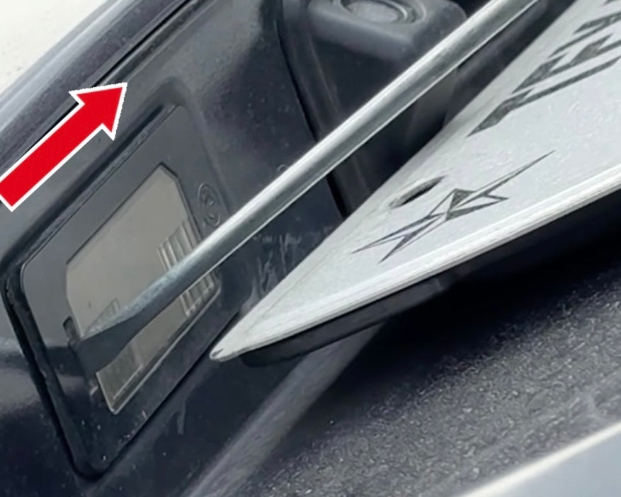 Loosen the license plate light assembly by wedging a flathead screwdriver in the gap shown above and firmly pulling the assembly in the direction of the red arrow.