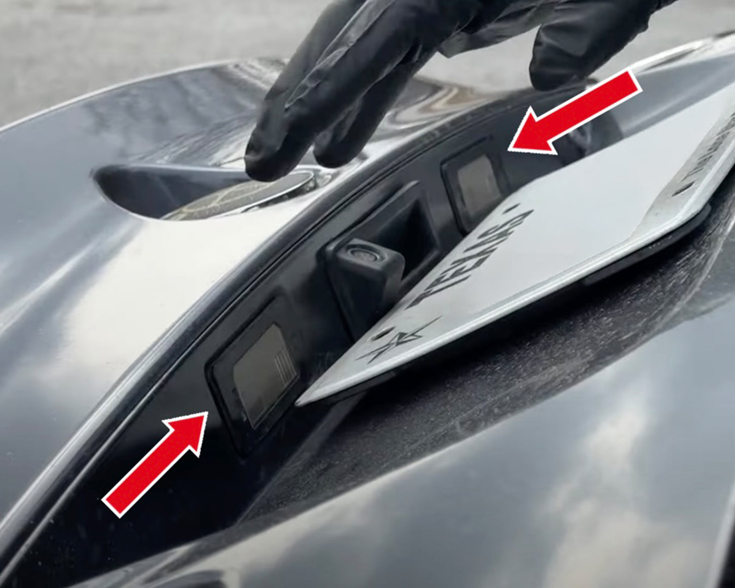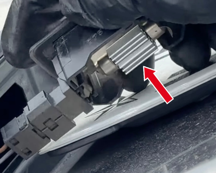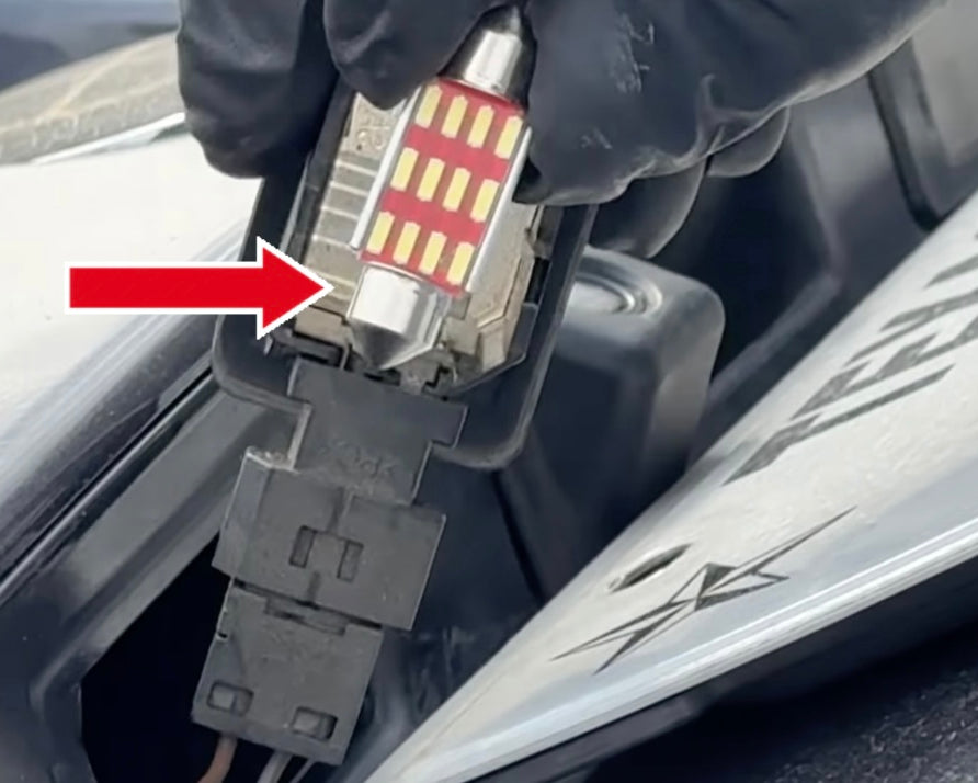 Remove the old license plate light (red arrow) by removing it from the metal clips holding it in place.