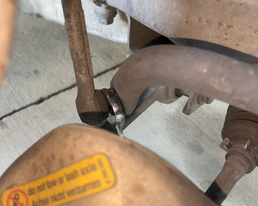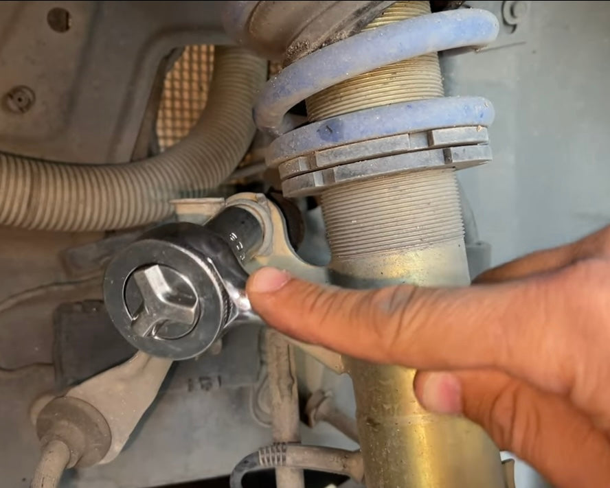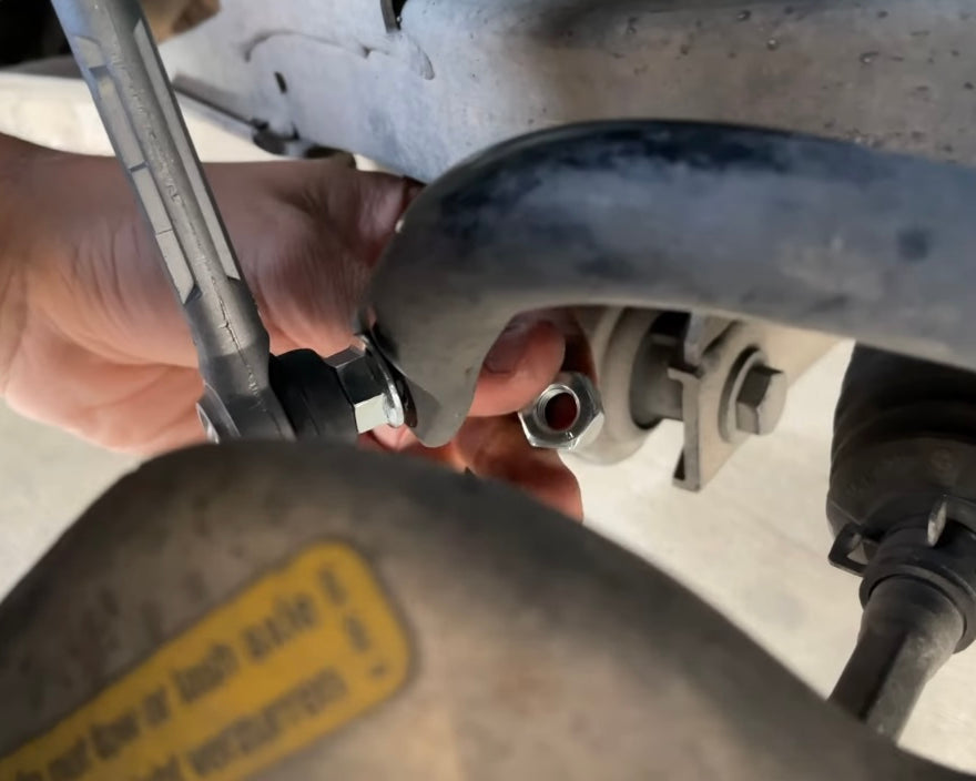 Remove the bottom sway bar end link nut using a 16MM to hold the nut itself and a 17MM wrench to counter-hold the rear nut. Turn the ratchet/socket counter-clockwise.