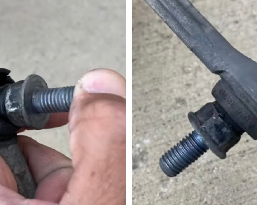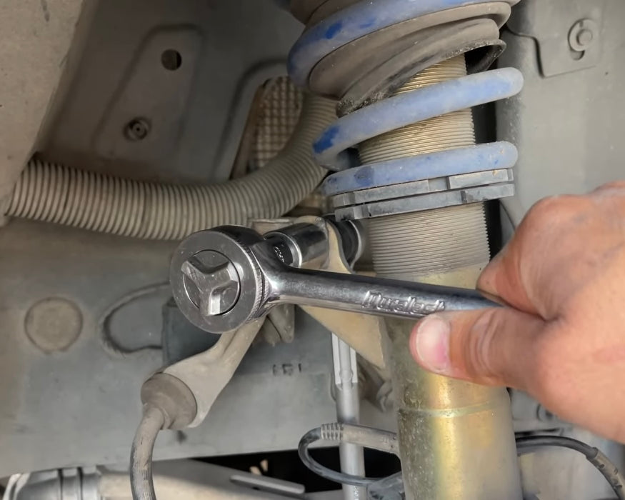 Hand-thread the lower end link nut to avoid cross-threading, then use a 16MM socket (nut) and 15MM wrench (counter-hold) to secure the nut.