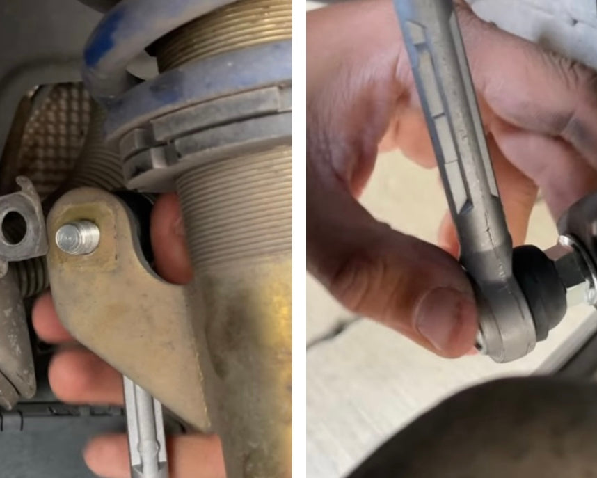 Hand-thread the upper end link nut to avoid cross-threading, then use a 16MM socket (nut) and 15MM wrench (counter-hold) to secure the nut.