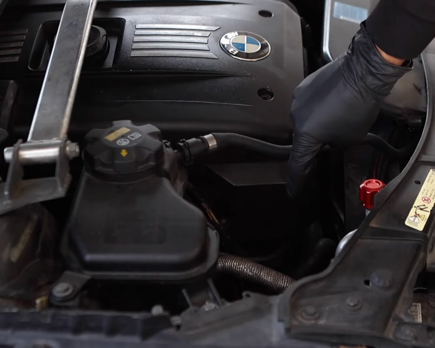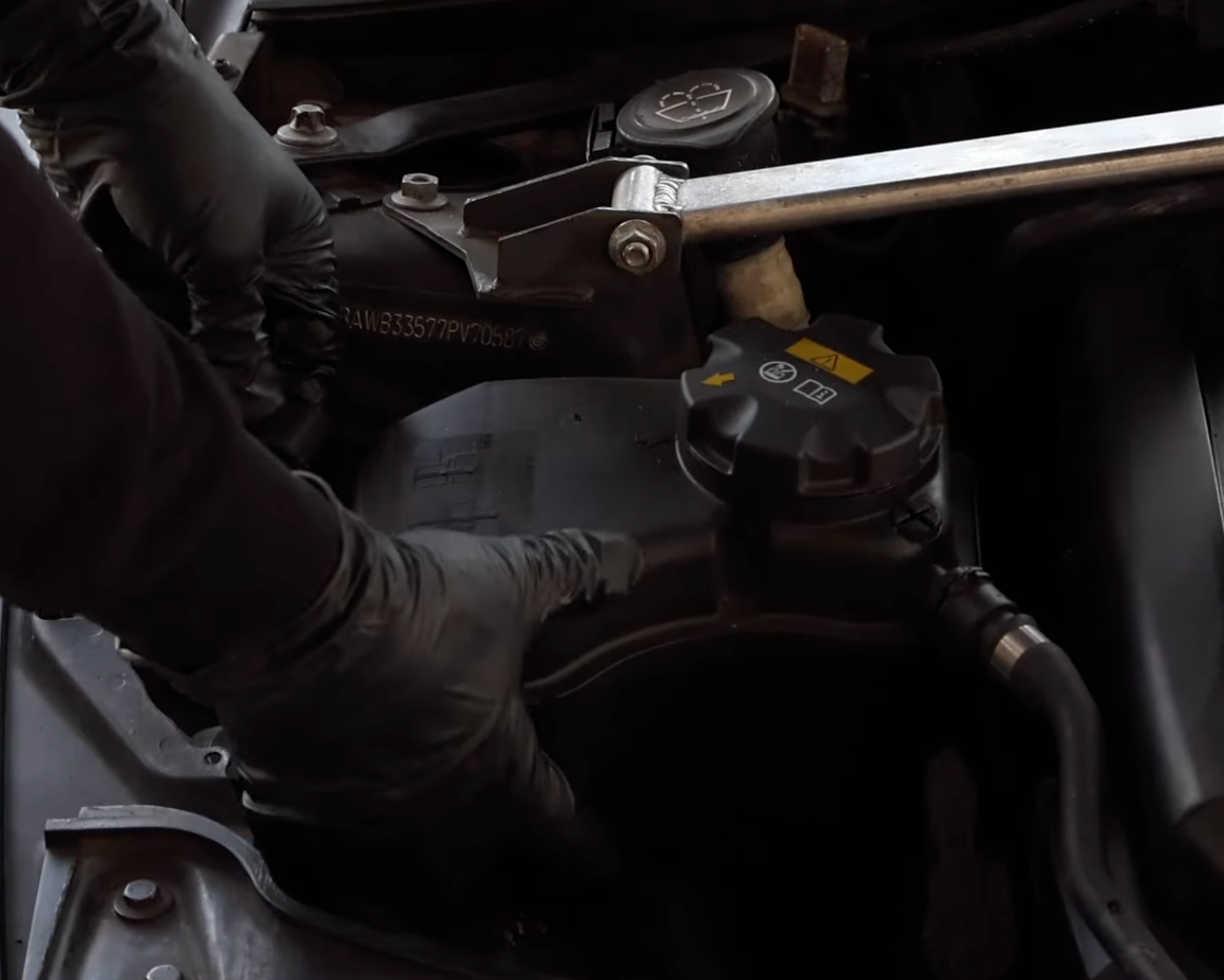 To access and remove the timing chain tensioner, the expansion tank must first be moved aside. On N5X engines, this is done by loosening and removing the two 10mm bolts securing the tank. Once removed, carefully shift the tank out of the way to create enough clearance for a ratchet or breaker bar to reach the tensioner. There's no need to disconnect the coolant lines.
