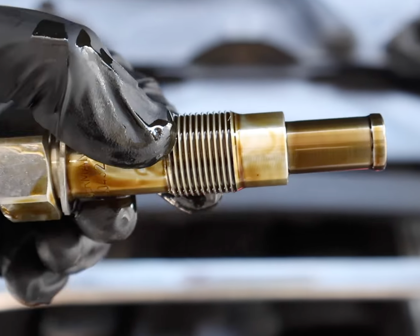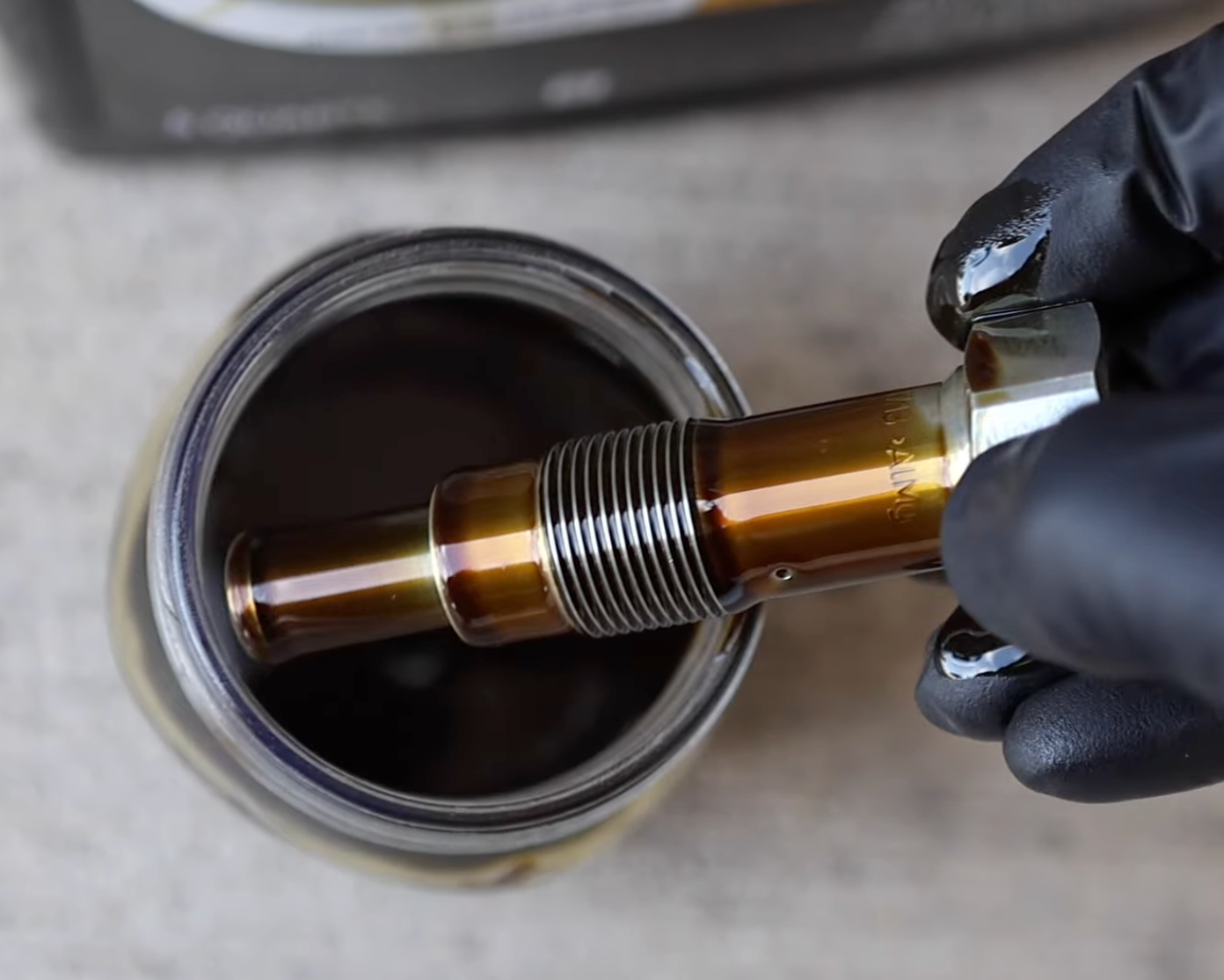 It’s crucial to soak the new timing chain tensioner in motor oil for at least 10 minutes with the piston side facing downward. This process removes air, fills the tensioner with oil, and ensures it can properly pressurize upon installation. Doing so also provides lubrication that minimizes the risk of damage from a dry start. Remove the crush gasket, place it to the side, then soak the tensioner.