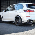 Featuring a sleek flat-contour profile with a sculpted edge lip, these side skirts accentuate the X5’s factory body lines while adding width and visual depth to the lower chassis. The result is a refined, road-dominant stance that perfectly complements the SUV’s bold front and rear carbon components.